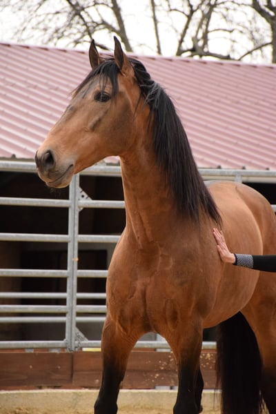 Dolar JC is 10 years old and stands at 1.63m. His IGG was evaluated at 107% during morphology competitions in Spain. His mother comes from the famous Peralta breeding! Beyond his origins, Dolar shows true ease under saddle. Very well trained, he masters the movements of high school: two-time changes, passage, piaffe, Spanish walk, and the approach to the pirouette. He is a sensitive and endearing horse, generous under saddle and curious about interaction. The ideal sport partner for a rider looking to advance their dressage while developing an exclusive relationship with this horse, who is as fine and refined as he is expressive. His radiographic report is perfect and available upon request. Like all horses joining Alegria, Dolar is educated according to the Complicity Relationship® curriculum, our educational method that guarantees safety and serenity. It is possible to reserve him now and continue his development with our support at the stud farm or through our online training. Price upon request, variable depending on the horse's education.