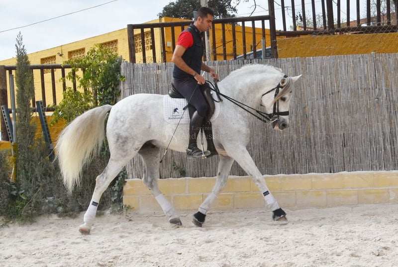 dear character with pleasant temperament, middle trot, lateral gaits, backward straightening, outside canter, gallop pirouettes, flying gallop changes, Spanish step, piaffe, passage, terrain, large, baroque, good pedigree, already has X-ray and is Piro negative, pedigree: Yeguada Militar, Yeguada Quintanilla, Lovera, San Roman, Grandpa Lobito IV and great-grandpa Fatuo de Nadales are qualified www.elegante-andalusier.com