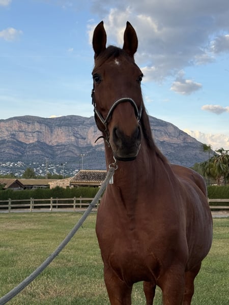 Biscochito, his stable name 🥰, has an impeccable character. He loves to work and simply wants to please, whether in the arena, riding through the countryside, or along the beach. He is very easy to ride in every way. He enjoys working on piaffe and passage, showing great ease and patience when teaching his rider. He is affectionate during handling and has been with us since he was two years old. He has also competed up to Intermediaire I level with his amateur rider. He has a clean vet check and is free of piroplasmosis. Additionally, he is starting to work on piaffe and passage.