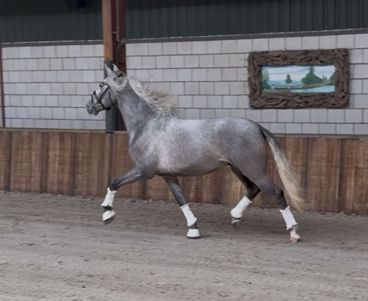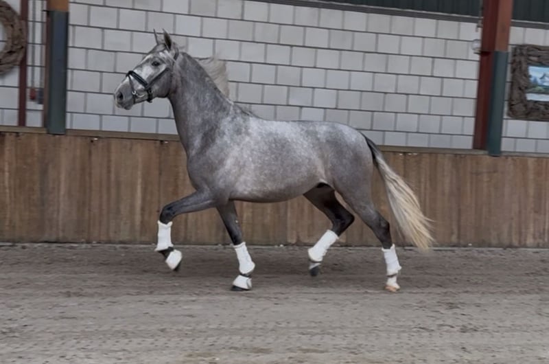 Are you looking for a real eye-catcher? A particularly talented horse with a complete presence: elegance, strength, and quality, combined with an outstanding pedigree (Bienvenido RJ x Jazminito V). Ruin, born on March 1, 2023, already stands out due to his striking appearance. With an current height of approximately 1.62 m (still growing), he is fully radiographically (including neck and back) and clinically approved. He possesses three very correct, well-moving gaits with suppleness, making him highly suitable for sport and leisure riding. In handling, he is reliable, calm, and easy to manage. Free of any stable vices. He is accustomed to lunging work and rider weight. Ready to start training. Further riding possible in consultation. Oud Gastel, NL 🇳🇱 0031-610197456
