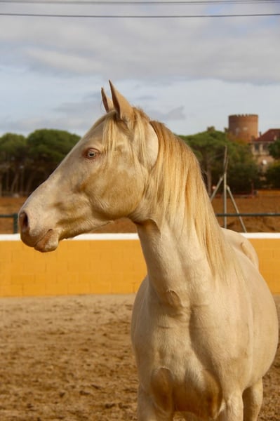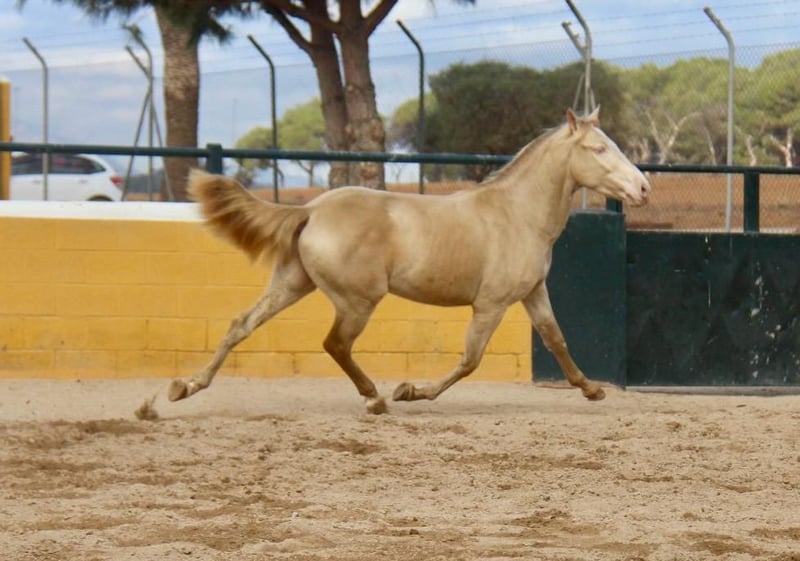Deze prachtige PRE-ruin in een speciale kleur zoekt zijn hartsmens. In zijn papieren staat de kleur Cremello, maar hij ziet er optisch meer uit als een Perlino. Qua karakter is hij een heel lieve, zeer open, nieuwsgierige en beleefde pony. Hij is 3 jaar oud en momenteel ongeveer 1,54 m groot. Naar volwassenheid schatten we hem op ongeveer 1,57-1,58 m. Hij kent al de basis van de veulenkamp en wordt momenteel voorbereid op het zadel, wat hij heel lief meemaakt. In de toekomst kunnen we ons hem in veel disciplines voorstellen, zowel in de dressuur, voor Working Equitation, voor shows als ook gewoon als vrijetijdspartner. Zijn jeugd heeft hij doorgebracht in een grote kudde van merries en hun veulens op de wei, en op ongeveer 8 maanden werd hij van zijn moeder gescheiden en kon hij zich uitleven in een jongehengstenkudde. Nu is hij op stal, zodat hij de box al kent. Hij heeft al röntgenfoto’s zonder afwijkingen. Locatie: Barcelona, Spanje. Een kennismaking in Spanje is mogelijk en het transport kan probleemloos geregeld worden.
