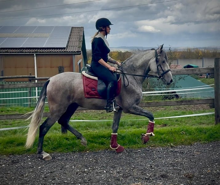 Nom : Tunante De Joca Race : P.R.E. (Pure Spanish Horse) Sexe : Hongre Date de naissance : 19/03/2021 Âge : 4 ans Taille : 1,55 m Couleur : Gris perlino Origine : documents disponibles Caractère : proche de l’humain, volontaire à l’apprentissage, fiable, curieux, intelligent Formation / Aptitudes : monté, loisir, dressage, équitation de travail Expérience en terrain : fiable, intrépide, seul ou en groupe Santé : vermifugé, vacciné, pied nu, sans eczéma, dents contrôlées, traité ostéopathiquement Hébergement : box, paddock Caractéristiques particulières : très confortable en selle, ferré et débourré, compatible avec le troupeau Les qualités mentionnées reposent sur notre appréciation personnelle et ne constituent pas une garantie. Prix : 7 900 € (taxes incluses) Vous avez suscité notre intérêt ? Pour vous donner une meilleure idée de Tunante, nous serions heureux de vous envoyer sa vidéo de monte. Bien entendu, nous restons à votre disposition pour une description détaillée du cheval, un conseil personnalisé et pour répondre à toutes vos questions, également par téléphone. N’hésitez pas à nous contacter à tout moment par WhatsApp ou à appeler au : +49 151 19487595 Nos horaires téléphoniques sont quotidiens de 7h00 à 13h30, puis à partir de 20h00. Nous attendons votre contact avec impatience ! Une inspection clinique ou radiologique préalable à l’achat peut être réalisée par le vétérinaire de votre choix. Bien sûr, Tunante peut être livré en toute sécurité et confortablement à votre nouveau domicile. Nous prenons en charge toutes les préparations nécessaires et le transport, afin que votre nouveau compagnon arrive sans stress, bien soigné, assuré et en bonne santé. Actuellement, nous proposons une sélection soigneusement choisie de chevaux à vendre. Chez nous, vous trouverez sûrement le cheval de vos rêves. Visitez également notre site Internet : www.marvinsroyalhorses.de. Chers clients, nous serons heureux de vous présenter nos chevaux. Vous pouvez également faire des visites, brosser, seller, longéer, faire du travail à pied ou des essais en carrière, sur le terrain ou en extérieur, pour mieux connaître votre futur compagnon. Ces services coûtent 40 € par cheval, 30 € pour chaque cheval supplémentaire, et sont remboursés lors de l’achat. Notre adresse : Ferdinand Grube 50 53577 Neustadt Wied Google Maps : marvinsroyalhorses