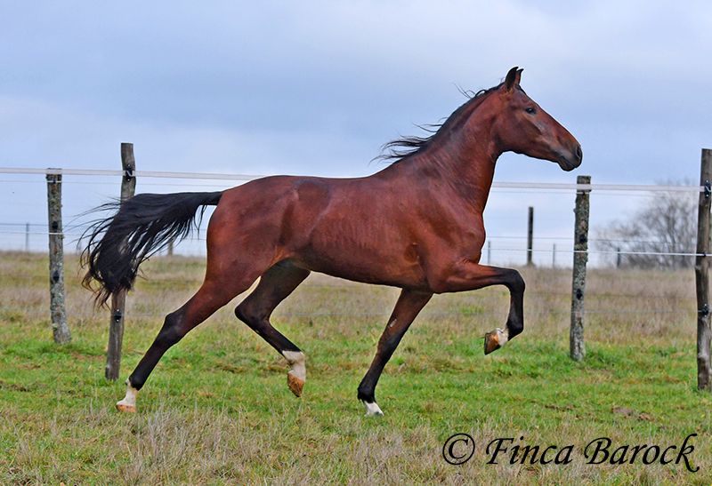 Raza: PRE Nombre: Bandolero Sexo: Macho castrado Altura: 1,61 m Fecha de nacimiento: 01.04.2022 Color: Castaño Precio: 5.500 € Padre: Bandolero CXXIII, hijo de Jilguero XII Madre: Manzanilla XL, hija de Volador XIII Bandolero, Un caballo muy elegante, con mucha expresión y movimiento, que con su carácter amigable conquista a todos en seguida. Bandolero está ligeramente montado en trabajo de doma y es un alumno ejemplar. Tiene una gran tranquilidad básica, lo que hace que trabajar con él sea aún más divertido. Es muy receptivo a nuevas experiencias y le encanta la variedad. Montar sin silla, caminar sobre una lona, perros que corren a su lado, tractores que pasan: Bandolero quiere estar allí. También ha realizado paseos en ruta y en situaciones "espeluznantes" se muestra más curioso que asustado, prefiriendo explorar que huir. Es cómodo en la silla y, de por sí, tiene un trote en subida muy bonito. Aún está en pleno crecimiento y se espera que siga desarrollándose. Está acostumbrado a vivir en manada, es juguetón y amigable. Incluye examen clínico veterinario y radiografías (se vende a un precio muy por debajo de su valor debido a un hallazgo en las radiografías). Contacto: Finca Barock, Tel. 0173-696 31 81, 56291 Wiebelsheim