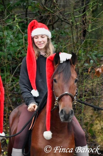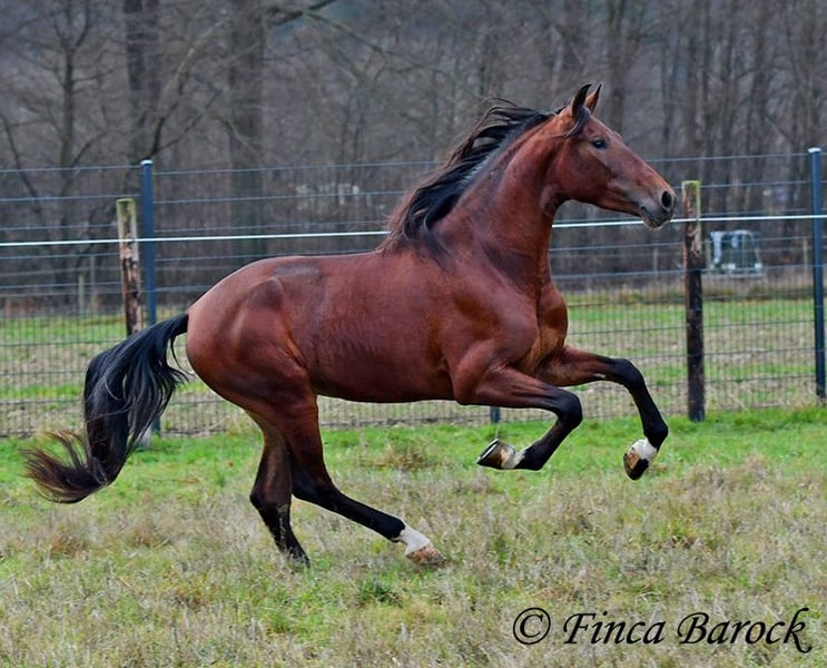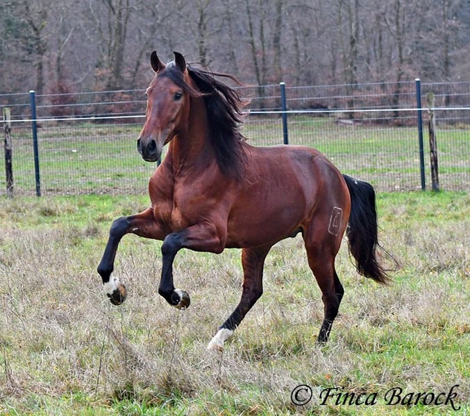 Breed: Andalusian (PRE) Name: Bandolero Gender: Gelding Height: 1.61 m (16.1 hh) Date of Birth: April 1, 2022 Color: Brown Price: €5,500 Sire: Bandolero CXXIII by Jilguero XII Dam: Manzanilla XL by Volador XIII Bandolero is a very handsome, energetic, and affectionate horse who quickly wins everyone over with his friendly nature! He has been lightly backed in the walk, trot, and canter and is a quick learner. Overall, he exudes a great natural calmness, which makes working with him even more enjoyable. He is very open to new experiences and enjoys variety. Riding without a saddle—sure! Walking over a tarp, with dogs running alongside, or passing tractors—Bandolero wants to be part of it all. He has already mastered his first trail rides and tends to be curious rather than scared when faced with "scary" objects, preferring to explore rather than retreat. Bandolero is a comfortable rider and naturally possesses a lovely uphill canter. He is still growing and will continue to develop in size. He is used to herd life, and shows playful and friendly behavior. Includes veterinary examination and X-ray images (due to an X-ray finding, he is offered at a significantly reduced price). Contact: Finca Barock, Tel. 0173-696 31 81, 56291 Wiebelsheim