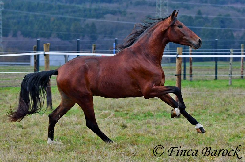 Rasa: PRE Imię: Bandolero Płeć: Wałach Wzrost: 161 cm Data urodzenia: 01.04.2022 Kolor: Brązowy Cena: 5500 € Ojciec: Bandolero CXXIII v. Jilguero XII Matka: Manzanilla XL v. Volador XIII Bandolero, świetnie wyglądający, energiczny i przyjazny koń, który swoim miłym usposobieniem od razu zjednuje sobie wszystkich wokół! Bandolero jest lekko wyprowadzony w podstawowym chodu i jest prawdziwym wzorcem do naśladowania. Ma w sobie dużą naturalną spokój, co sprawia, że praca z nim jest jeszcze przyjemniejsza. Jest bardzo otwarty na nowe doświadczenia i chętnie bierze udział w różnorodnych aktywnościach. Jazda bez siodła? Oczywiście. Przechadzki po plandece, towarzyszenie psom, przejazdy traktorami – Bandolero chce być zawsze tam, gdzie się dzieje. Pierwsze wyjazdy w teren również poszły mu świetnie, a podczas „strasznych” sytuacji jest raczej ciekawski i woli je zbadać, niż się cofać. Jest wygodny w siodle i ma od natury świetną, dynamiczną galopadę pod górę. Wciąż rośnie i będzie jeszcze się rozwijał. Przyzwyczajony do życia w stadzie, wykazuje się zabawowym i przyjaznym usposobieniem. W cenie: kliniczne badanie weterynaryjne oraz zdjęcia rentgenowskie (z powodu wykrytego na rentgenie stanu oferowany znacznie poniżej wartości rynkowej). Kontakt: Finca Barock, tel. 0173-696 31 81, 56291 Wiebelsheim