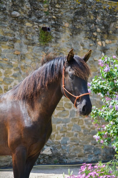 COMIC, poulain PRE noir de 3 ans, 165 cm de hauteur, récemment sorti du pré, avec de très bons mouvements et une bonne morphologie. Il commence son débourrage et commence à être monté.