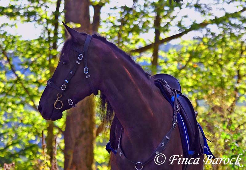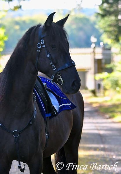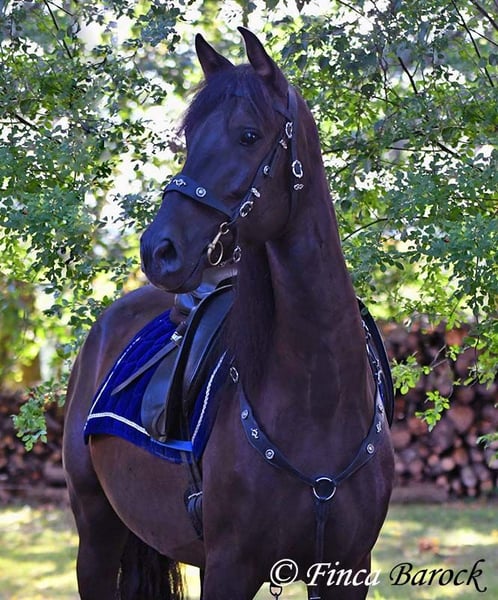 Breed: PRE Name: Ouorum SH Gender: Gelding Height: 163 cm Age: 01.09.2020 Color: Black Price: €14,999 Sire: Halcon SH by Lastur Dam: Imperiosa CXXXI Quorum is a cuddly, very people-oriented boy of nice size. He has been gently backed and has had time to mature. Overall, he is still fully in development and will fill out a bit more. Equipped with a great uphill canter and comfortable movements, he already provides a very pleasant riding experience. Overall, Quorum is not very spooky. He demonstrates this during trail rides. Whether on the road, highway, or with barking dogs, Quorum remained cool and relaxed in every situation. He enjoys going out alone as well as in a group. Of course, Quorum is still at the beginning of his training but already possesses a great basic calmness. He has a good work ethic and enjoys variety. He is familiar with groundwork, lunging (also over poles and cavaletti), and participates well in free work. Quorum is accustomed to herd living (including mixed herds) and is pasture-raised. A handsome boy directly from the breeder who is waiting to explore the woods with his person but also enjoys working in the arena. Includes clinical veterinary examination and X-rays. Contact: Finca Barock, Tel. 0173-696 31 81, 56291 Wiebelsheim
