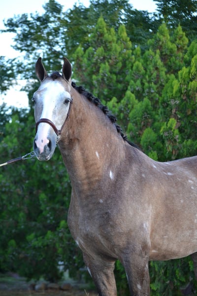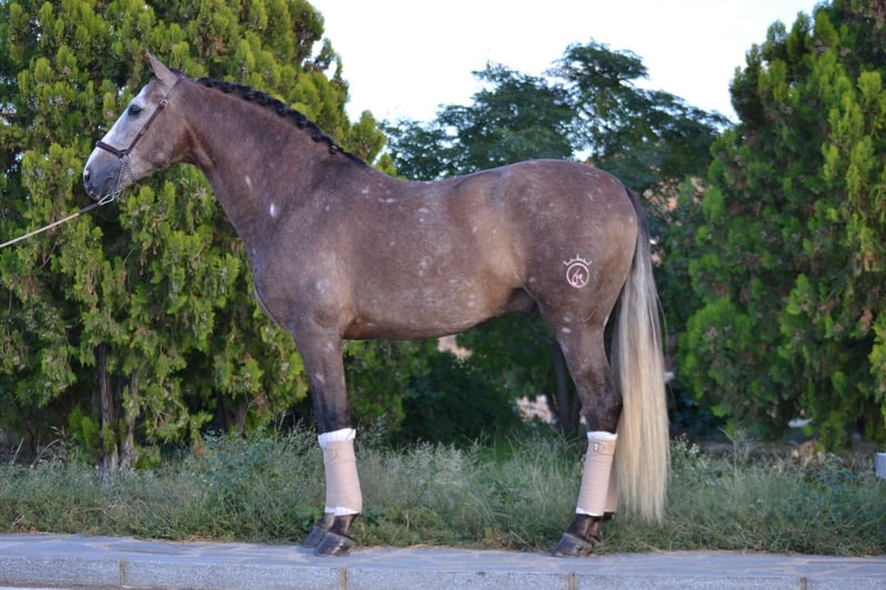 Er wurde Anfang dieses Jahres aus Spanien importiert und besitzt ein ausgezeichnetes Temperament, sowohl unter dem Sattel als auch im Stall. Er hat viel Charakter, liebt jede Aufmerksamkeit und Kuschelstunden. Seit seiner Ankunft hier zeigt er keine Stallprobleme; er wird über Nacht im Stall untergebracht und tagsüber mit einem anderen Wallach zusammen auf der Weide gehalten. Im Schulunterricht lernt er noch, daher benötigt er einen erfahrenen und geduldigen Reiter, der seine Ausbildung weiterführt. Er wurde langsam aufgebaut, zeigt aber drei gute Grundgangarten auf dem Platz, mit großem Trab und kraftvollem Galopp. Er ist sehr willig, hat eine ausgeprägte Arbeitsmoral und möchte stets gefallen. Kürzlich wurde er an Stangenarbeit gewöhnt und wird seine Fortschritte weiter machen, solange er zum Verkauf steht. Er hat bereits eine kleine Kreuzstange übersprungen. Er ist regelmäßig ausgeritten, meist alleine, reitet aber auch gerne in Gesellschaft ohne Nervosität. Er zeigt sich in offenen Räumen sehr manierlich und verhält sich ruhig in der Nähe von Autos, Fahrrädern, Hunden und Nutztieren. Da er noch jung ist, ist er neugierig und schaut sich gerne um, weshalb ein verständnisvoller Reiter erforderlich ist, der ihm bei Bedarf das nötige Selbstvertrauen gibt. In Zukunft wird er ein vielversprechender Dressur- und Freizeitpartner sein.