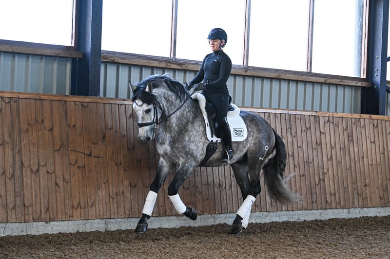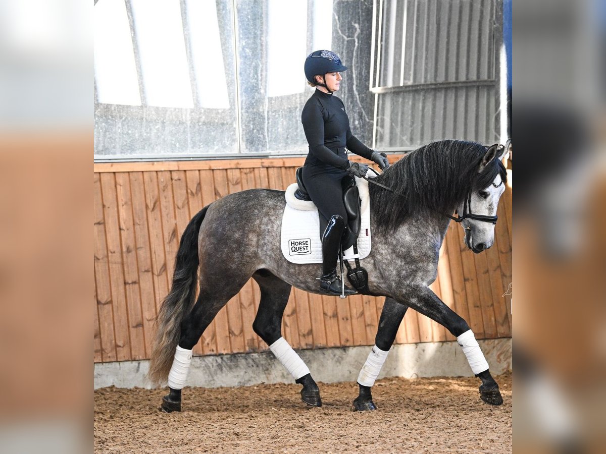 Paolo is a 10-year-old PRE gelding standing at 1.56 meters with excellent basic gaits. Unfortunately, I need to part with him due to personal reasons. Paolo is a special horse. He is not suitable for beginners or as a children's horse. He does not handle stressful situations or hectic movements well. He requires a calm rider who can provide him with the necessary security, patience, and trust. Sufficient saddle fit and a calm, balanced seat are essential. Once he has gained your trust, he works well with you. I am looking for someone who will give him the time he needs. Building trust and developing a partnership with him is primarily achieved through groundwork. Prior experience in this area would be advantageous. He trusts humans more from the ground than when ridden. During the day, he is kept on pasture, and at night, he stays in a paddock box. I would like this type of keeping to continue. He is worked with in various disciplines, including groundwork, dressage, jumping, and trail riding. He is comfortable riding alone or in a group. He has already enjoyed trail riding on cross-country courses. In dressage, he is at an A level, with initial L-level movements. He loves pole work and makes a great jumper. Currently, he is at E level, with some jumps at A level. I would be happy to have a phone call beforehand to get to know each other better.