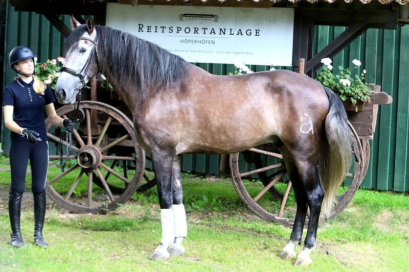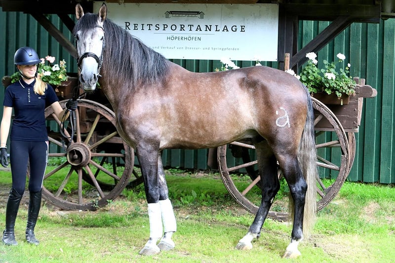 Hij betreedt het levenspodium met een uitstraling die de ziel raakt – een paard dat niet alleen door zijn verschijning indruk maakt, maar ook door zijn innerlijke noblesse de harten verovert: Onze vijfjarige PRE-bruine ruin "Marquez", een majestueuze prins in glanzend wit, met een stokmaat van 1,70 m – krachtig, elegant en tegelijkertijd vol zachtheid. Zijn aderen dragen het bloed van de groten: Vaderlijk uit het legendarische huis Yeguada Marín García, dat niet minder dan de Olympische Grandioso III heeft voortgebracht – een naam die kenners doet stralen. Zijn merrielijn wordt gekenmerkt door de invloedrijke lijnen Escalera en Lazo Díaz – een combinatie die in diepte en klasse zelden te vinden is. Zijn uitstraling – trots en alert, met een blik die verstand en gevoel tegelijk verraadt. Zijn lichaam – harmonieus gebouwd, met een draagkrachtige rug, actieve achterhand en een toplijn die het hart van iedere dressuurliefhebber sneller doet kloppen. Hij beweegt met de lichtheid van de zuidwind over het rijterrein, zijn gangen – elastisch, taktzeker, van natuurlijke opwaartse houding. Of hij nu onder het zadel staat of aan de hand wordt geleid – hij toont zich altijd coöperatief, nieuwsgierig en mensgericht. Wat deze prachtige ruin echter bijzonder maakt, is zijn buitengewoon fijne karakter: Marquez is een rots in de branding – luidruchtige machines, wegverkeer, een hectische omgeving? Voor hem geen reden tot onrust. Met een oplettende geest, innerlijke balans en een groot hart benadert hij de wereld – vriendelijk, liefdevol, eerlijk en diep mensgericht. Zijn merkteken draagt een gestileerde “a” – voor het stal Aquilino. Maar wie hem kent, weet: deze “a” staat voor veel meer. Marquez is: – “a”fhankelijk in zijn uitstraling, – “a”fgetraind in verschijning en beweging, – “a”rdentijk – met adellijke houding en natuurlijke waardigheid, – een “a”fgezien partner met hart en verstand, – “a”ansprekend – ja, eigenlijk zelfs “a”antrekkelijk in zijn hele manier. Hij is altijd “a”chtig en “a”uthentiek, straalt expressie uit en blijft toch kalm. Eenvoudigweg “a”fregend mooi – maar in zichzelf rustend als een oude meester, ondanks zijn jeugdige vijf jaar. Als u op zoek bent naar een partner met charisma, aanwezigheid, betrouwbaarheid en een uitstekende genetische basis – dan zou deze edele zoon van Spanje precies kunnen zijn wat u tot nu toe slechts hebt durven dromen.