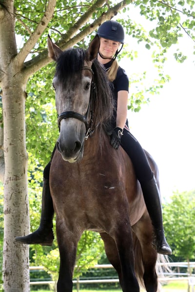 Este potro de 6 años de la raza PRE, con una altura de 1,70 m, es un representante destacado de su raza. Se presenta como un caballo de porte grande, bien conformado, con una estructura armoniosa, buena base y una apariencia equilibrada en conjunto. En cuanto a carácter, es difícil encontrar algo que lo supere. Es un caballo que se puede dejar solo en el remolque, en el que parece que no lleva ningún caballo, y que en ambientes desconocidos se comporta con tanta tranquilidad y agrado como en casa. Lamentablemente, todavía no ha encontrado un nuevo dueño, ya que, sorprendentemente, ha sido simplemente demasiado grande hasta ahora. Marquez es un caballo sumamente cómodo, que transmite seguridad a cualquier jinete. Trabaja de manera equilibrada en la pista de doma y se puede montar solo o en grupo en el campo. No es un caballo desconfiado y siempre se regula bien. En la cuerda, a veces le gusta soltarse, pero bajo la silla nunca haría eso. Pedigrí: Por parte paterna, Marquez proviene de la Yeguada Marín García, una reconocida ganadería de la que han salido, entre otros, el olímpico Grandioso III. La línea materna remonta a las conocidas líneas Escalera y Lazo Díaz, combinando genética PRE probada. Exterieur y movimiento: Marquez posee una espalda bien sustentada, una activa parte trasera y una línea superior sólida. Sus movimientos son rítmicos, elásticos y claramente estructurados, con equilibrio natural y suficiente libertad en los hombros. Bajo la silla y en mano, se muestra trabajador, atento y cooperativo. Carácter y comportamiento: Destaca por su carácter tranquilo y equilibrado. Marquez es fuerte de nervios y se mantiene calmado ante estímulos ambientales como el tráfico, máquinas o ambientes ruidosos. Es cercano a las personas, amable y honesto en el manejo diario, por lo que también es apto para jinetes menos experimentados. Formación y uso: Un caballo de cría sólido, con excelentes aptitudes para la doma, pero también interesante como caballo de confianza y de ocio. Gracias a su carácter y tamaño, es adecuado también para jinetes de mayor estatura. Marca de identificación: Lleva la marca del Haras Aquilino. Resumen: Un ejemplar típico de PRE, con carácter fiable, buena genealogía y potencial para diversos usos: un caballo honesto para jinetes que valoran la doma, la tranquilidad y la calidad.