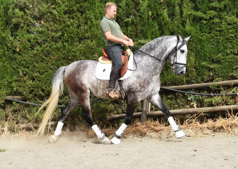 dear character, ridden in the basic gaits, outside canter, lateral movements, backing up, passage, some flying changes, backing up, terrain, Feria, Romeria, has already participated in dressage competitions, baroque, has already undergone X-rays and is Piro negative, lineage: Candau, Romero Benitez, grandfathers Bronco XVI and Africano XXVIII are qualified www.elegante-andalusier.com