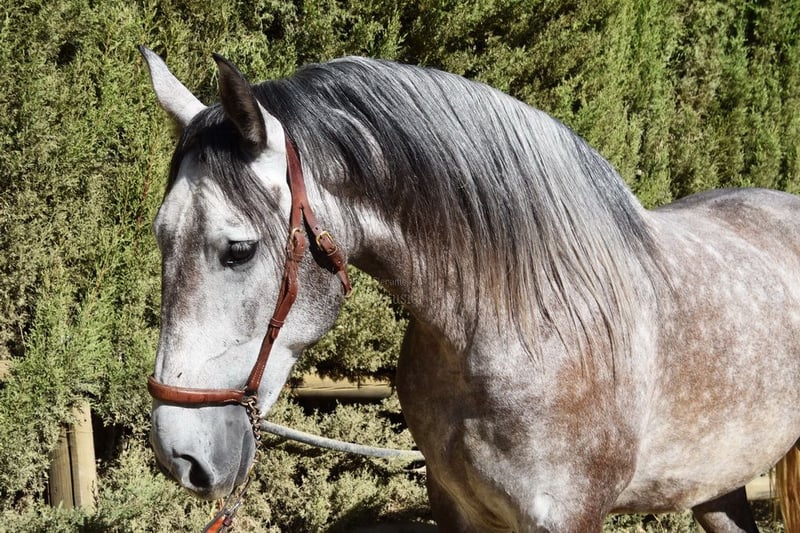 caractère agréable, monté aux trois allures de base, galop extérieur, mouvements latéraux, reculer, passage, quelques changements de pied au galop, reculer, terrain, Feria, Romeria, a déjà participé à des concours de dressage, baroque, a déjà passé des radiographies et est négatif pour la piroplasmose, origine : Candau, Romero Benitez, grands-pères Bronco XVI et Africano XXVIII sont qualifiés www.elegante-andalusier.com