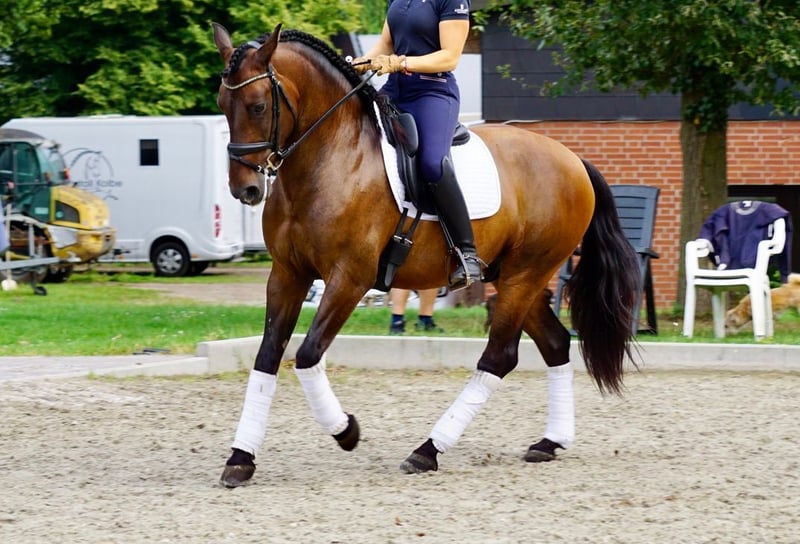 PRE gelding Favorito SB V – 6½ years old Exceptionally trained – working equitation & dressage at the highest level Favorito is no ordinary horse – he is a partner for riders who are looking for something special. He combines baroque beauty, heart and intelligence with a level of training that is rarely found in such a young horse. 💫 Training & talent Trained in Spain by an internationally renowned trainer who has prepared horses for Borcelli, Kenzie Dysli and other show riders. He was then trained by a Spanish dressage master and is currently being trained by the German champion in working equitation. He has mastered half-passes, outside canter, flying changes, pirouettes, passage – and works confidently throughout the entire trail: one-handed over the bridge, opening & closing gates, garrocha, ring pick-up, bell, tight canter circles – calm, precise, focused. 💖 Character & behaviour Sensitive, clear-headed, willing to perform and absolutely people-oriented. A horse that always gives his all and trusts his rider. Not yet a competition horse – but a young, expressive athlete with great potential for 2026. 📍 Data PRE gelding, born 2019 (6½ years old) approx. 164 cm, dark brown, baroque type barefoot, eczema-free, good with the farrier TÜV / X-rays without findings