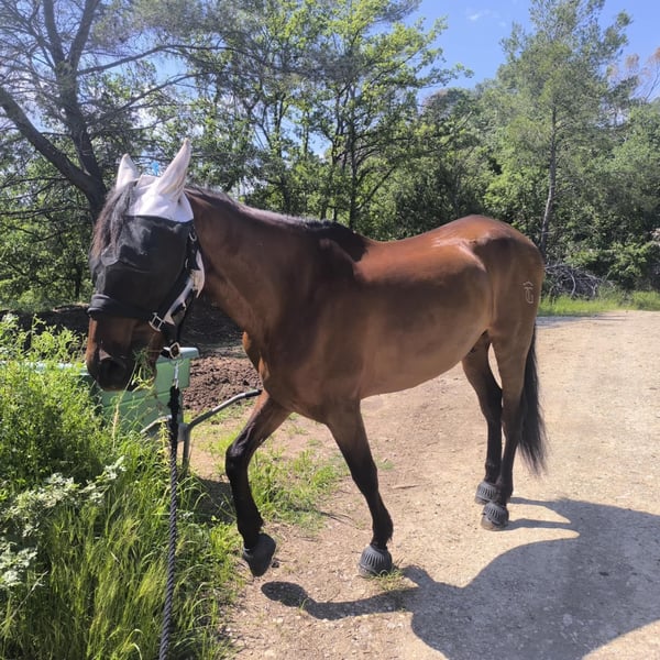 Ce cheval possède un gabarit harmonieux et une locomotion fluide. Il est actuellement travaillé et convient à un cavalier de niveau Galop 5. C'est un compagnon idéal pour un cavalier souhaitant évoluer en compétition ou se faire plaisir au quotidien. Note : Le cheval est marqué à la cuisse gauche (marque visible sur les photos), ce qui peut aider à identifier son élevage ou ses origines.
