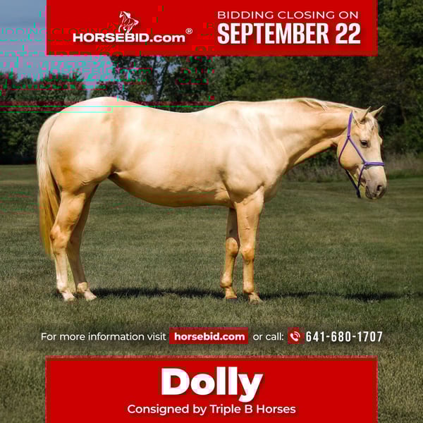 🍁𝒕𝒉𝒆 𝐅𝐀𝐋𝐋 𝑺𝒑𝒆𝒄𝒕𝒂𝒄𝒖𝒍𝒂𝒓🍁 Happening now thru MONDAY | SEPTEMBER 22nd - Available EXCLUSIVELY on HorseBid's website! For more details and to register visit: www.Horsebid.com CONSIGNOR CONTACT: Triple B Horses 641-680-1707 LOCATION: Plano, Iowa BREED: Quarter Pony REGISTERED: No COLOR: Palomino HEIGHT: 14.1 AGE: 10 GENDER: Mare Dolly is a gorgeous palomino mare standing the perfect height of 14.1 hands and built to carry ALL size riders! Needing something short yet stocky- Dolly is your gal! No mounting block needed, but don’t worry she will stand next to one for easy mounting if needed! Dolly is easy to catch, gets along well with other horses, stands tied, loads easy, good for the farrier, and good for the vet. She is sweet but respectful on the ground. She tacks up with no issues, leave her sit for months on end and you can pull her from the pasture saddle up and go- no lunging needed. She has an easy one hand neck rein making her the perfect pick to have a drink in one hand and steer with the other. She will walk, trot, lope with ease. She is very smooth and has never offered to buck, bite, kick, or rear. Dolly has seen all the sights in town and at the camp grounds. Nothing phases this girl! Our town has their fall festival fair set up and she rode through all the rides like she had seen them a million times. We even stopped at the local bar for some good and she waited patiently outside tied to the stop sign. While Dolly does ride super well in the arena she is the BEST trail horse. Slippery mud? No problem. Steep ditches? That’s a breeze. Big logs? She’s got it. This girl is as sure footed and trustworthy as you can get. We have throughly enjoyed having Dolly around and can not wait to see her next family enjoy her as much as we have! The limitations to this mare are endless. Take her jumping, fun shows, 4H, trails, junior rodeos, flags. She is willing for any task you give her! Dolly is 100% sound and current on all cares. Please call or text for any questions you may have! I would love to talk about her and find her a forever family!