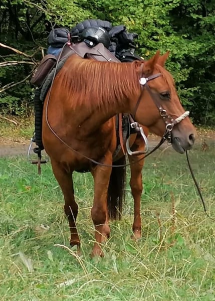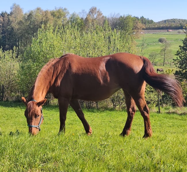 Quarter Mix mare, available only in an allergy-friendly pasture environment! Preferably near the coast. Nayeli suffers from equine asthma; medical records are available, and she will only be placed in suitable stabling. With proper management (haylage, dust-free bedding, etc.), she is symptom-free and fully rideable. She is a very affectionate horse, well-behaved in handling, and used for leisure riding. Safe in open terrain and traffic, familiar with arena and riding hall, trail riding, groundwork, clinics, and daily farm life. Farrier- and loading-friendly.