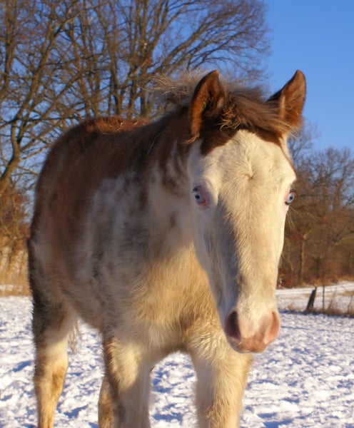 In auffälliger chestnut overo Optik präsentiert sich dieser Hengstjährling mit 2 blauen Augen, Vater: Paint, Kingsley n jills wood, Mutter: Deutsches Reitpony, von Boss jr., das Fohlen hat volle Papiere, wüchsig, fröhlich, besonders