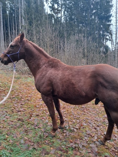 Wir suchen für unseren, sehr nervenstarken, freundlichen Quarter Hengst ein verstänisvolles neues Zuhause. Goldi, so nennen wir den Hübschen, ist 5,5 Jahre alt, ca 148 cm groß ,mit einer sehr schönen rotgoldenen Farbe. Er ist noch nicht geritten, kennt jedoch das alleine mit dem Menschen spazieren gehen und ist da sehr zügig unterwegs, er lässt sich von nichts beeindrucken, egal was am Wegesrand steht oder liegt oder sich bewegt. Goldi war schon im Deckeinsatz und ist immer händelbar. Gegenwärtig läuft er mit einer Stute und einem Wallach auf der Weide, er ist sehr tolerant. Warum wir Goldi weiter geben, er und ich, finden leider nicht zusammen. Irgendwie hab ich den Eindruck daß er eher ein Männerpferd ist. Goldi lebt im Offenstall, das soll auch im neuen Zuhause so sein, er braucht viel Platz um zufrieden zu sein. Auch hat er einiges an Temperament, das sieht man wenn er mit den anderen Pferden über die Weiden galoppiert, Kopf im Wind und den Schweif über den Rücken. Zuhause ist Goldi im schönen Südschwarzwald. Für mehr Informationen,sowie ,weiteren Bilder und Videos, stehen wir sehr gerne telefonisch zur Verfügung. Uns ist ein persönliches Gespräch wichtig. Und bitte, bedenkt, ob Ihr einen Stall habt und auch die finanziellen Mittel, für ein Pferd. Herzliche Grüße und eine gesegnete, freudvolle Weihnachtszeit .