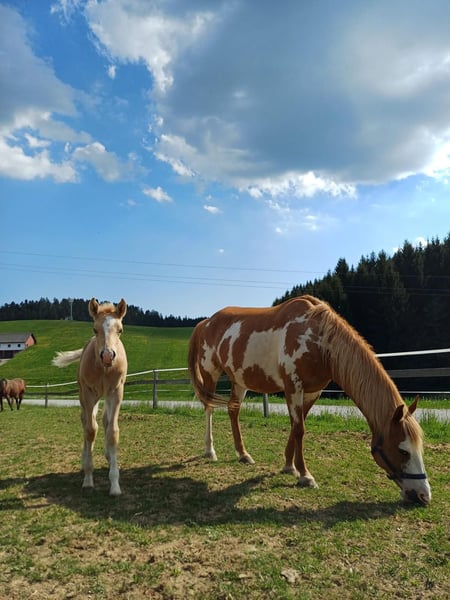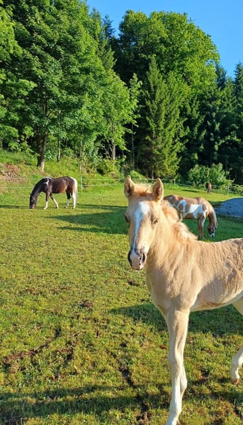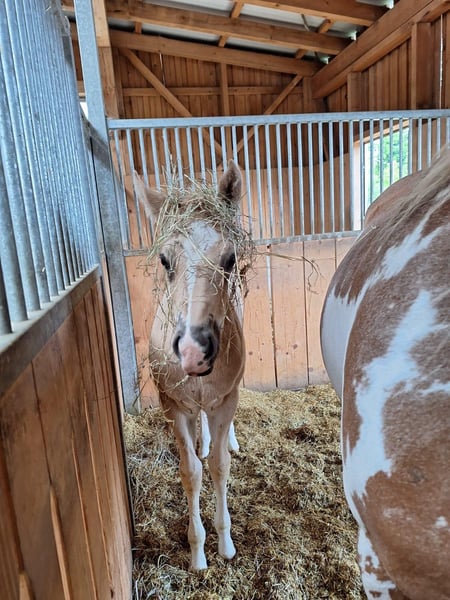 For sale is our beautiful, healthy colt - SUNNY. Character: - Alert, curious, and people-oriented - Already shows impressive calmness - Very social within the herd - Learns quickly and is extremely attentive Development & Health: - Healthy development - Regular veterinary care - Vaccinated and dewormed according to schedule Raising & Keeping: - Lovingly raised in a family atmosphere - Daily interaction with children - Species-appropriate housing with plenty of space - Daily turnout in the herd What we offer: - All papers and health certificates - Opportunity to get to know him on-site - Insight into the loving upbringing We are looking for: A responsible family or experienced horse people who can give our colt the time and attention he needs for his optimal development. Only to the best hands! If you are seriously interested, we look forward to your contact.