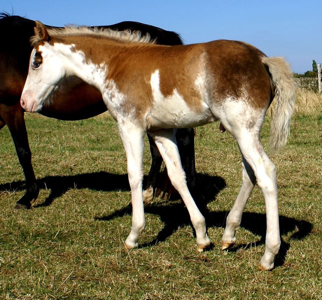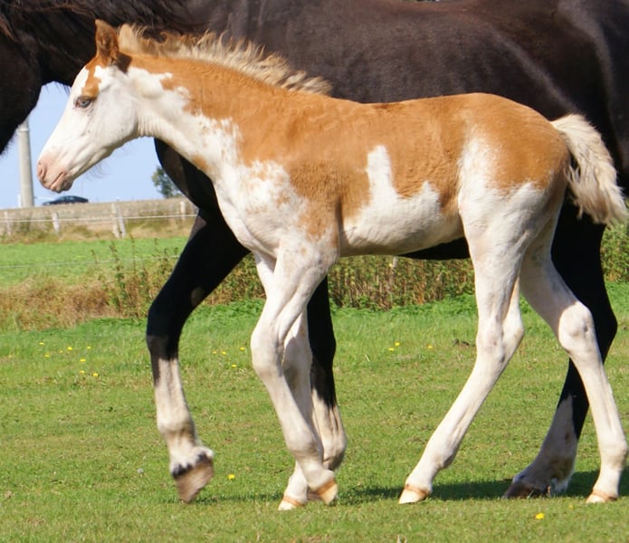 In auffälliger chestnut overo Optik präsentiert sich dieses Hengstfohlen mit 2 blauen Augen, Vater: Paint, Mutter: Deutsches Reitpony, das Fohlen hat volle Papiere, wüchsig, fröhlich, besonders