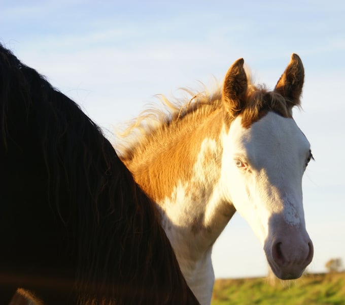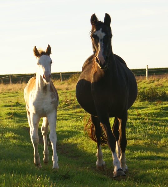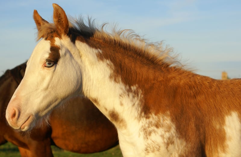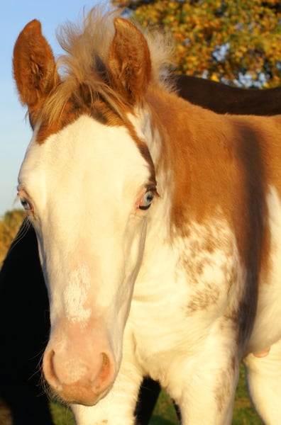 This colt features an eye-catching chestnut overo coat and has two striking blue eyes. His sire is a Paint horse, and his dam is a German Riding Pony. The foal comes with full papers, is well-grown, cheerful, and particularly special.