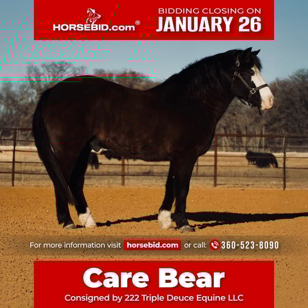 𝐉𝐀𝐍𝐔𝐀𝐑𝐘 ⭐️𝑨𝒍𝒍 𝑺𝒕𝒂𝒓 𝑳𝒊𝒏𝒆𝒖𝒑⭐️ Happening now thru MONDAY | JANUARY 26th - Available EXCLUSIVELY on HorseBid's website! For more details and to register visit: www.Horsebid.com CONSIGNOR CONTACT: 222 Triple Deuce Equine LLC 360-523-8090 LOCATION: Cisco, TX BREED: Quarter Pony REGISTERED: No REGISTERED NAME: Care Bear COLOR: Black HEIGHT: 13.3 AGE: 13 GENDER: Gelding Care Bear is a flashy black quarter pony gelding that is indeed a safe and trusty steed! Perfect size for novice adults or children. If you're looking for more whoa than go, this is your guy! Care Bear's favorite speed is a walk, with motivation, he will trot and lope! He is a great trail mount for riders who have absolutely zero experience. He will follow along and is not spooky or reactive! He can sit for months or even years and never get fresh; pull him out, and you can expect the same speed and demeanor he’s always had. Although he has no fancy buttons, he is worth his weight in gold when it comes to safety and dependability. Leadline deluxe or solo rides inside or outside the arena, Care Bear can get you there. Located in Cisco TX Current Negative Coggins & Health Certificate Shipping Available Nationwide 360-523-8090