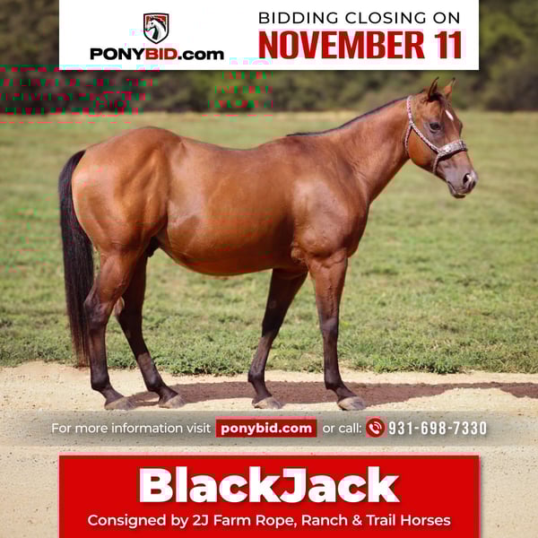 𝓽𝓱𝓮 𝐑𝐈𝐃𝐄𝐑'𝐒 𝓒𝓱𝓸𝓲𝓬𝓮 🐴 𝐏𝐎𝐍𝐘 𝐄𝐃𝐈𝐓𝐈𝐎𝐍 🐴 Happening now thru TUESDAY | NOVEMBER 11th - Available EXCLUSIVELY on Ponybid's website! For more details and to register visit: www.Ponybid.com CONSIGNOR CONTACT: 2J Farm Rope, Ranch & Trail Horses 931-698-7330 LOCATION: Culleoka, TN BREED: Quarter Pony REGISTERED: No COLOR: Bay HEIGHT: 13.3 AGE: 8 GENDER: Gelding 🔹This beautiful gelding quarter pony we call ♠️BlackJack♣️ is safe, dependable and as steady as they come! His gorgeous glossy bay coat is unblemished other than a few purely cosmetic scars on his back legs, which do not affect his soundness at all. He is 8 years old, which means that he’s old enough to have been-there-done-that and yet he still has many years left to give to the lucky family who ends up taking him home. 🔹Standing a little over 53” tall, or around 13.3 hands, BlackJack is also the perfect height for kids and will also comfortably fit a medium-sized adult. Rest assured if you invest in BlackJack, your kids won’t outgrow him for many, many years - if ever!! 🔹Blackjack has been trail rode by children of various ages for many years. He has been exposed to all the sights and sounds of trail riding and is happy to either lead or follow. 🔹On the ground, he’s patient and loves the attention kids bestow on him. He stands nicely for the farrier, loads and unloads calmly, and gets along with everyone in the herd. 🔹BlackJack is the kind you hold onto and don’t let go! Good ponies are few and far between and when you find a good one, you cherish them! My boys do more team roping than trail riding and BlackJack deserves someone to give him all the attention he desires and to explore the trails with. 🔹If you’re looking for safe, sweet and sound - look no further than BlackJack! Don’t let him slip away - go ahead and put a bid in on this stellar pony!! 🔹BlackJack sells 100% sound and with his current Coggins. Nationwide shipping is available and we would be delighted to help with arranging transport to his new home! 🔹For more info. on BlackJack or to schedule a visit to come and see him at our farm in beautiful middle Tennessee, please call Levi at 931-698-7330.