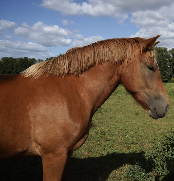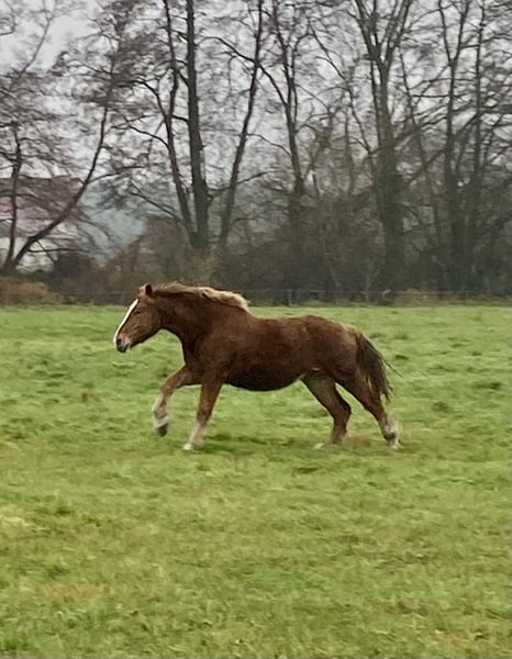 Svala ist eine fast 3-jährige Rheinisch-Deutsche Kaltblutstute (PSSM1 frei) und entstammt einer Antonio x Orloff Mutter. Der Vater ist Conrad v. Brück (bis M platziert). Diese schöne Jungstute in auffälliger Dunkelfuchsjacke mit großem Auge und sportlichem Körperbau ist dem Menschen sehr zugewandt, aufmerksam und verschmust. Svala wächst im altersgemischten Herdenverband auf und ist weder die ranghöchste noch rangniedrigste Stute. Sie besitzt volle Papiere, ist gechippt und wird regelmäßig entwurmt, geimpft sowie dem Schmied vorgestellt und kennt das Verladen mit Anhänger und LKW. Sie passt aufgrund ihrer Farbe leider nicht in unsere Gespanne und sucht ab demnächst ein neues Zuhause.