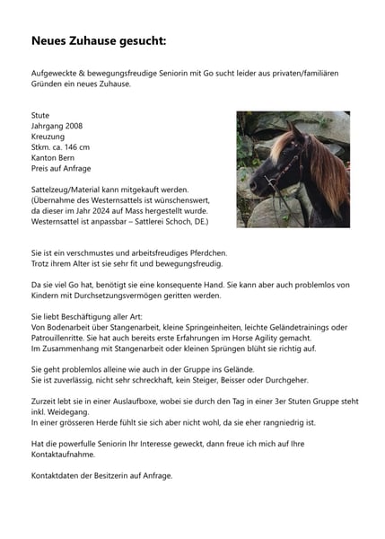 Verkaufe liebevolle Rocky Mountain Horse Stute Zum Verkauf steht eine wunderschöne Rocky Mountain Horse Stute, geboren im Jahr 2008. Sie ist ein eleganter Dunkelfuchs mit einem beeindruckenden Stockmaß von 148 cm. Diese zuverlässige und freundliche Freizeitpartnerin begeistert durch ihr angenehmes Wesen und ihre vielseitigen Einsatzmöglichkeiten. Ob für ausgedehnte Ausritte, entspannte Spaziergänge oder gemeinsame Freizeitgestaltung – sie ist stets motiviert und angenehm im Umgang. Da sie doch sehr bewegungsfreudig ist, ist sie kein Tier für Anfänger. Sie kann jedoch auch von Kindern mit Durchsetzungsvermögen und weichem Sitz/ weicher Hand geritten werden. Bei Interesse oder weiteren Fragen stehe ich Ihnen gerne zur Verfügung.