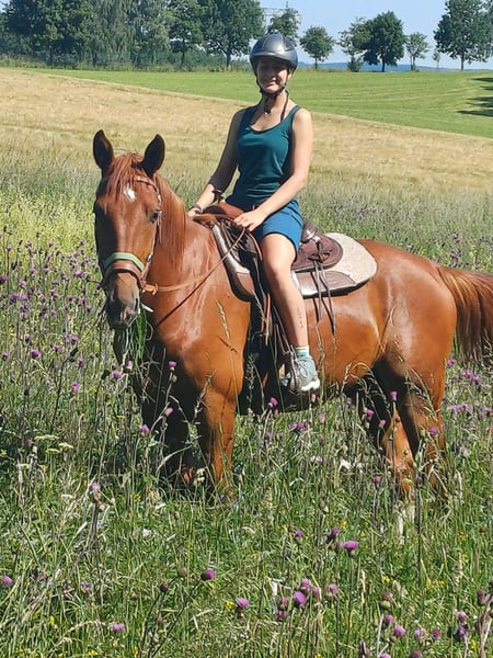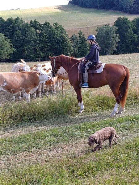 Sehr typvolles Sächsisches Warmblut vom Moritzburger Hengst Lilienstein. Er ist robust in Offenstallhaltung, in einer gemischten Herde aufgewachsen und lief als Fohlen beteits mit seiner Mutter an der Kutsche. Lio wurde sehr schonend und liebevoll gebisslos angeritten. Er läuft zuverlässig in allen 3 Grundgangarten im Gelände wird da auch von Jugendlichen geritten. Er hat ein sehr stabieles Fundament was ihn gut zum Gewichtsträger macht. Hufpflege,Hängerfahren,Tierarzt/Impfung selbstverständlich ohne Probleme. Der sanfte Riese ist sehr Menschenbezogen liebt Bodenarbeit, lange Geländeritte und genießt jede Art der Zuneigung. Wir wünschen uns für ihn eine stabiele Herde und Menschen mit viel Liebe zum Pferd.