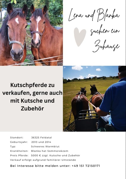 *Verkaufe im Auftrag* → Bei Interesse und weiteren Fragen bitte direkt melden unter +49 151 72150171 • Standort: 36325 Feldatal • Geburtsjahr: 2013 und 2014 • Typ: Schweres Warmblut • Krankheiten: Blanka hat Sommerekzem • Verkauf erfolgt aufgrund familiärer Umstände • Privatverkauf Kutsche und Zubehör wird ebenfalls verkauft!