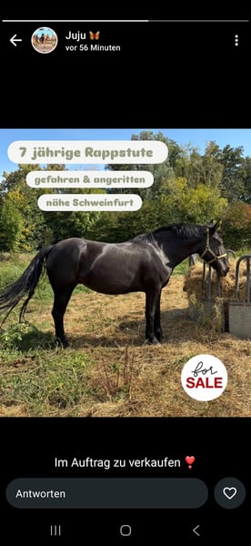 Hello, I am offering my beautiful young mare "Bella" for sale. She is 7 years old, a heavy Warmblood, and suitable for larger and stronger riders. She stands approximately 155 cm tall. Due to her young age, she is looking for a rider who can provide her with a sense of security from the saddle. According to her previous owner, she is also well-schooled. I have only ridden her in the field, where she requires a rider who can give her confidence. However, she is not mean or aggressive. Her teeth have recently been checked. She receives regular osteopathy treatments and is also regularly seen by the veterinarian. Currently, we are focusing more on groundwork training. She is completely healthy. Of course, a pre-purchase exam can be arranged at the buyer's expense. Why I am selling her: I am an insecure re-entrant rider and am looking for a horse that I can simply enjoy riding at a walk. The horse should give me confidence. Initially, I thought we could grow together as a team. But the longer Bella has been with me, the more dominant she has become. Therefore, I have decided to find a different solution. The price is negotiable. However, she will not be given away for free. A trade for a reliable, balanced, and older trail horse would also be considered. Feel free to contact me :)