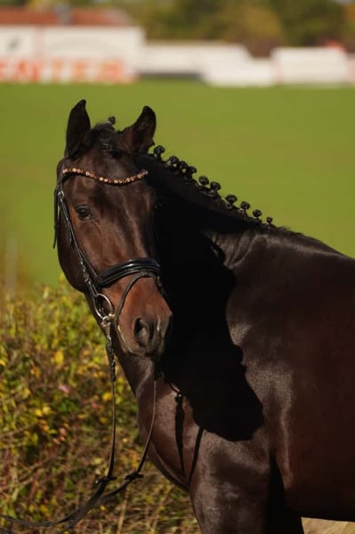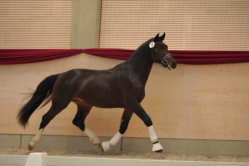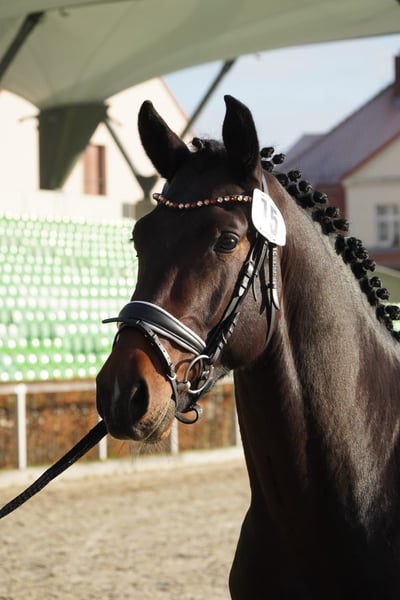 Na zlecenie hodowcy prezentujemy konia czołowego rasy czołowego typu czołowego, Lexters Leif, urodzonego w 2023 roku. Uroczy ciemnogniady waży 163 cm w kłębie i ma obwód kości śródręcza 24 cm. Wziął udział w dniach hodowlanych w listopadzie w Moritzburgu, dlatego na razie jest jeszcze ogierem, jednak nie wykazuje żadnych cech typowych dla ogierów. Leif ma znakomity charakter, jest całkowicie odważny i chętnie pracuje. Codziennie zachwyca swoim przyjemnym usposobieniem, rzadko się denerwuje, co czyni go wszechstronnym partnerem do różnych zastosowań. Dzięki doskonałemu chybaniu, rytmicznemu kłusowi i pięknej, dynamicznej galopadzie jest idealnym partnerem dla ambitnych jeźdźców lub dla jeźdźców rekreacyjnych na wyższym poziomie. Ze względu na dobrą muskulaturę, przygotowując go do selekcji ogierów, oraz podczas dni hodowlanych w Moritzburgu testowaliśmy go z obciążeniem jeźdźca. W tym testie pokazał się jako spokojny i bardzo łatwy w obsłudze. W razie zainteresowania chętnie udzielę dodatkowych informacji i umówię się na oględziny.