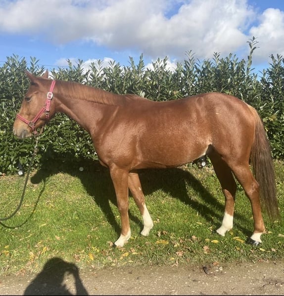 Joli hongre de 4 ans (père anglo Tino de Nouvolieu) Qq parcours en CL1 avec cavalier pro et amateur Très facile à pied et à cheval Bonne tête ne regarde rien Prêt pour la piste Voyage van et poids lourd ok Tonte maréchal Osteo dentiste ok Bonne visite.