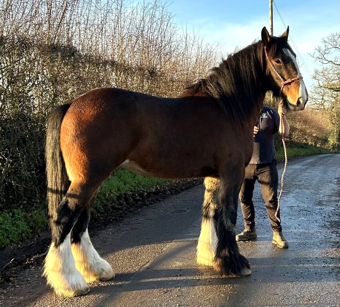 This kind and friendly mare is good to handle, good with other horses and really nice to have around. She has bred several nice foals and should breed again if required Likes people, used to other farm animals, good to wash, with her feet etc Wormed up to date and feet trimmed. Transport arranged. For more about her contact sheila@shiresandclydesdales.com All enquiries very welcome
