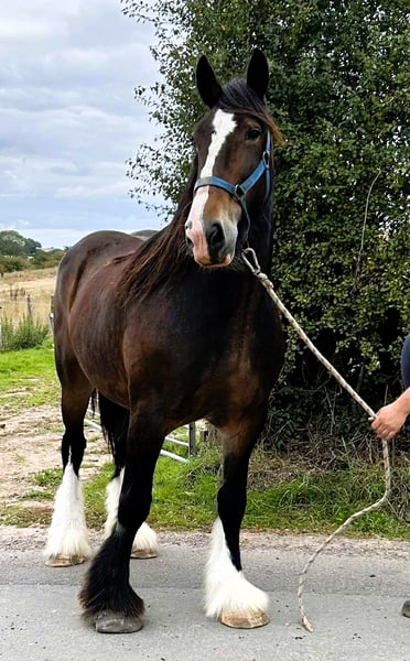 Deze mooie traditionele Shire merrie is vriendelijk en gemakkelijk te hanteren. Ze is erg vriendelijk en prettig in de omgang. Ze heeft verschillende goede veulens gebracht. Het is een stevige merrie van een type dat tegenwoordig moeilijk te vinden is. Ze is niet getraind voor rijden, maar heeft veel potentieel. Ze is heel gemakkelijk te vangen in de wei, houdt van mensen, is goed met andere paarden en gewend aan andere boerderijdieren. www.shiresandclydesdales.com Verenigd Koninkrijk en wereldwijd 07919 605350