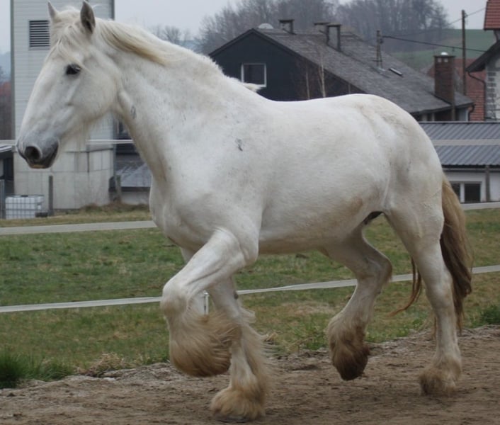 Vielen Dank für das Interesse an unserer wunderschönen Shire Horse Stute Saffron. Saffron wurde 2013 geboren und verfügt über volle Papiere der englischen Shire Horse Society. Sie bringt alle positiven Eigenschaften dieser beeindruckenden Rasse mit – ein ruhiges Temperament, Verlässlichkeit und einen ausgeglichenen, menschenbezogenen Charakter. Im Umgang ist sie freundlich, aufmerksam und arbeitswillig – eine Stute, die ihrem Menschen gefallen möchte und sich über jedes Lob ehrlich freut. Ursprünglich wurde Saffron bei uns als Zuchtstute erworben. Kurz nach ihrer Ankunft stellten wir jedoch eine Warzenmauke an einem Hinterfuß fest. Diese lässt sich mit regelmäßiger Pflege sehr gut in Schach halten und verursacht ihr aktuell keinerlei Einschränkungen im Alltag oder beim Reiten. Da wissenschaftlich bisher nicht eindeutig geklärt ist, ob Mauke oder die Neigung dazu erblich sein könnten, haben wir uns entschieden, sie nicht weiter in der Zucht einzusetzen – aus Verantwortung gegenüber Tier und Nachzucht. Aus diesem Grund wird Saffron weit unter ihrem eigentlichen Wert abgegeben – statt 6.900 € nun 3.900 €. Diese Preisreduktion spiegelt nicht ihre Qualität wider, sondern soll sicherstellen, dass sie in liebevolle und verantwortungsvolle Hände kommt, die bereit sind, ihr die nötige Pflege und Aufmerksamkeit zu schenken. Saffron befindet sich derzeit im Beritt und zeigt sich dort als zuverlässiges, motiviertes und ausgesprochen braves Reitpferd. Mit ihrer Gelassenheit und ihrem Arbeitswillen ist sie sowohl auf dem Platz als auch im Gelände ein treuer Partner. In der Herde ist sie sozial und verträglich, lebt harmonisch mit anderen Pferden zusammen und kennt sowohl Offenstall- als auch Boxenhaltung. Am wohlsten fühlt sie sich in einer Paddockbox mit viel Bewegung und regelmäßigem Weidegang. Tierarzt und Hängerfahren sind für Saffron kein Problem. Beim Hufschmied übt sie derzeit noch den Vertrauensaufbau, macht dabei aber stetig Fortschritte. Selbstverständlich wird sie regelmäßig geimpft, entwurmt und ist in sehr gepflegtem Zustand. Wir wünschen uns für Saffron ein Zuhause bei Menschen, die ihr mit Geduld, Liebe und Freude begegnen und bereit sind, ein paar kleine Pflegeeinheiten mehr in Kauf zu nehmen, um im Gegenzug eine treue, sanfte und dankbare Shire Horse Stute an ihrer Seite zu haben. Ein Kennenlernen ist jederzeit nach Terminvereinbarung möglich – gerne auch im Rahmen eines „Shire Horse Tages oder Wochenendes“ bei uns am Hof in Oberösterreich. So kann das erste Zusammentreffen in aller Ruhe und stressfrei erfolgen. Übernachtungsmöglichkeiten gibt es direkt in der Nähe unseres Hofs. Unsere Pferde werden nur in beste Hände und ein passendes Zuhause abgegeben. Uns ist wichtig, dass auch das Pferd mitentscheiden darf – denn die Chemie zwischen Mensch und Tier muss einfach stimmen. Auch unsere weiteren Shire Horses freuen sich immer über nette Besucherinnen und Besucher. Wir freuen uns über eine Nachricht für Saffron, eine charakterstarke Stute, die mit ihrer Ausstrahlung und ihrem Herz jeden begeistert, der ihr begegnet.
