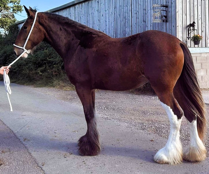 Beautiful two year old filly. Shire father and Clydesdale mother - registered with The Shire Horse Society with some great horses in her line. She is not very big, sturdy and well made, she should be wonderful for someone looking for a filly with all the benefits of the breeds and a lovely manageable size. Lovely limbs and thick feather and flowing mane and very pretty markings. For more about her please contact sheila@shiresandclydesdales.com UK and worldwide