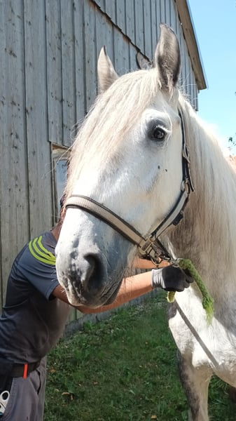 Hartelijk dank voor uw interesse in onze Shire Horse merrie Twinkle. Twinkle is geboren in 2019 en heeft momenteel een schofthoogte van ongeveer 1,75 m, waarbij ze nog in de groei is. Ze beschikt over volledige papieren van de Engelse Shire Horse Society. Ze komt uit onze fokkerij en is vanaf het begin met andere veulens en later in een gemengde kudde opgegroeid. Beide ouders hebben een evenwichtig en vriendelijk karakter. Twinkle is in een kudde opgegroeid en kent zowel 24/7 buitenverblijf als de stal. Momenteel leeft ze in een open stal, maar ze kent ook de box. In de groep is ze eerder ranghoog, maar ze houdt er ook van om met haar paardenvrienden te knuffelen. Nu ze 5 jaar oud is, zijn we begonnen met haar berijden. Twinkle valt op door haar snelle begrip en haar kalmte. Als ze iets niet begrijpt, blijft ze staan in plaats van geschrokken te raken en haar zenuwen te verliezen. Ze is mensgericht en nieuwsgierig. Alle paarden worden pas vanaf een leeftijd van 5 jaar voorzichtig door ons bereden. Tot die leeftijd ligt de focus vooral op gehoorzaamheid, grondwerk en training in kalmte. Het werken met Twinkle is vooral leuk en plezierig vanwege haar motivatie. Natuurlijk beschikt ze over alle benodigde vaccinaties tot nu toe en wordt ze regelmatig ontwormd en aan de hoefsmid voorgesteld. Zowel bij de dierenarts als bij de hoefsmid is Twinkle ongecompliceerd; ze geeft braaf haar hoeven en laat verder alles met zich doen. Ook het rijden in de trailer is geen probleem voor haar. Bij serieuze interesse is een vrijblijvende kennismaking uiteraard op elk moment mogelijk; we zijn het beste bereikbaar via Whatsapp voor meer informatie. Onze dieren worden alleen in de beste handen en een leeftijdsappropriatie thuisgegeven, daarom is het voor ons belangrijk om voldoende tijd voor geïnteresseerden te nemen. Ook vinden we het belangrijk dat het paard mee beslist, want ook voor onze dieren moet de chemie kloppen. De getoonde foto's zijn zowel recente foto's als foto's van haar opleiding van vorig jaar en twee jaar geleden, daarom is de kleur van Twinkle in de loop der tijd veranderd. U kunt ook een vrijblijvende kennismaking met Twinkle organiseren als een "Shire-Horse-dag of -weekend" op onze boerderij, zodat een wederzijds "snuffelen" in alle rust en zonder stress kan plaatsvinden. Twinkle woont in de buurt van Bad Füssing. Er zijn overnachtingsmogelijkheden met heerlijk eten op loopafstand van onze boerderij. In de nabije omgeving zijn er ook enkele mooie thermen, zodat een korte vakantie in onze buurt zeker de moeite waard is. Ook "niet-ruiters" zijn bij ons van harte welkom. Daarnaast bieden we begeleide ritten en wandelingen met onze zachte reuzen in prachtige natuur aan. Ook minder ervaren ruiters zijn van harte welkom om mee te gaan; in dat geval wordt het paard vanaf de grond geleid. Cadeaubonnen hiervoor zijn ook bij ons verkrijgbaar en hebben al voor menige mooie verjaardagsoverrassing gezorgd. Verder zijn er ook graag indrukken van onze paarden te vinden op ons Whatsapp-kanaal. Bij interesse sturen we de link hiernaar graag toe.