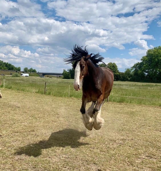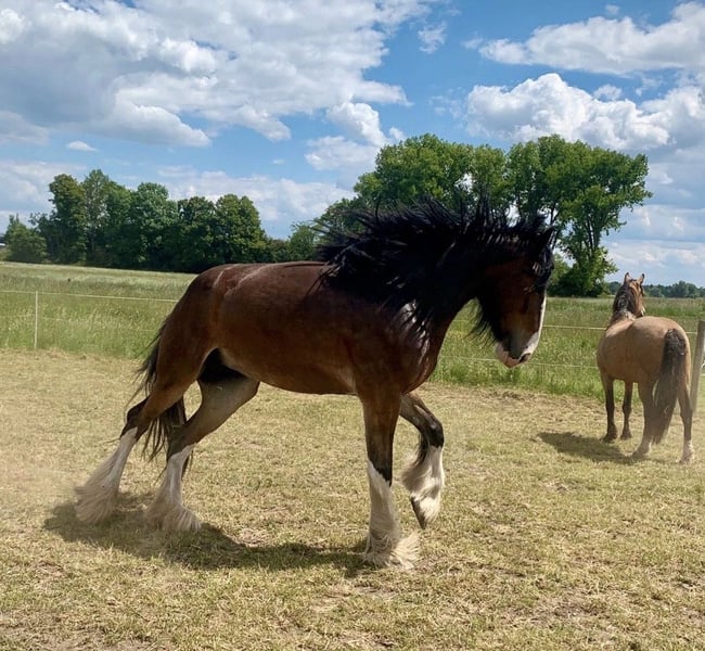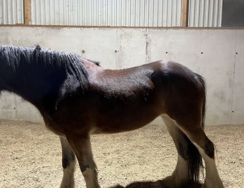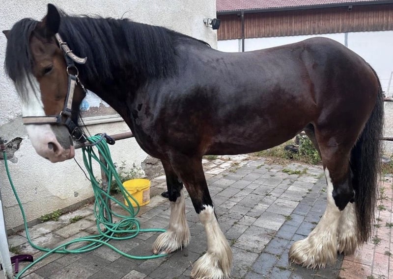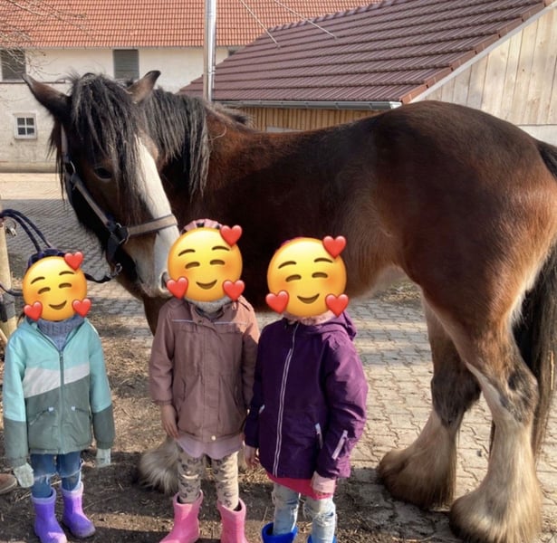 Shire Horse Stute, geb. 2019, ca. 1,70 m – sensibel, menschenbezogen & mit viel Potenzial Schweren Herzens - Aufgrund veränderter Umstände suche ich für meine Shire Horse Stute ein passendes, langfristiges Zuhause. Kein Notverkauf. Sie ist eine sehr liebe, verschmuste und sensible Stute, die eine enge Bindung zum Menschen aufbaut. Im Umgang zeigt sie sich freundlich, aufmerksam und gut händelbar. Im Wesen ist sie eher ruhig und gemütlich, zeigt aber bei Spiel und Motivation auch schöne, schwungvolle Bewegung. Sie ist sehr aufmerksam, lernwillig und fein in der Kommunikation – bei klarer, ruhiger Führung baut sie schnell Vertrauen auf und orientiert sich stark am Menschen. Sie ist gut erzogen, halfterführig und lässt sich problemlos anbinden sowie alleine stehen. Hufschmied und Tierarzt sind kein Problem, insbesondere mit vertrauter Bezugsperson. Im Alltag zeigt sie sich absolut unkompliziert: – kennt Hunde, andere Tiere, Kinder (liebt sie) und Straßenverkehr – bleibt auch in ungewohnter Umgebung ruhig (z. B. Autobahnbrücke) – lässt sich problemlos waschen/abspritzen – kennt Decke, Fliegenhaube und Spray Alleine spazieren gehen ist problemlos möglich. Sie kennt Bodenarbeit und wird aktuell schonend an das Reiten sowie an das Einspannen herangeführt. Satteln und Gurt sind ihr bekannt, sie kennt bereits Reitergewicht. Sie wächst im Herdenverband auf, ist ranghoch, aber fair und sehr verträglich. Offenstall sowie Box mit Paddock sind ihr bekannt – sie hält die Box sauber und macht zuverlässig draußen. Kein reines Anfängerpferd – bei ruhiger, klarer Führung jedoch sehr kooperativ. Barhuf, gesund. SHS Papiere Braun mit vier weißen Abzeichen an den Beinen und schönem Behang Freizeit, Gelände, später auch für Arbeit oder Gespann interessant. Transport ist gegen Aufpreis möglich. Zubehör kann ebenfalls gegen Aufpreis übernommen werden. Big Sunshine Margie - Braun Vater: Decoy Prince Charming - Rappe Mutter: Brickell Eileen - Braun