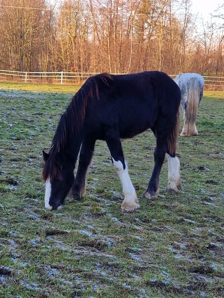 Thank you very much for your interest in our Shire Horse colt Fraggle. Shire Horse Fraggle was born in the summer of 2024 and is a beautiful young boy. He will remain dark in color. His dam Grace stands at 1.80 m, and his sire Duke measures 1.94 m at the withers. Therefore, it is very likely that Fraggle will also become a larger representative of his breed. Unfortunately, Fraggle has developed a swelling in his hocks, which has confirmed the suspicion of a chip. At the moment, Fraggle is sound and free of any complaints. After consultation with our veterinarians, it was decided not to carry out surgery for the time being. Due to this issue, Fraggle is now being offered below his actual value – in any case, a suitable home is more important than the price. Fraggle particularly impresses with his adorable appearance. At first, he is cautious with new people, but once he has gained trust, he enjoys grooming sessions and being petted. He leads well in a halter and is familiar with all the “standard activities” for a young horse (grooming area, hoof care, brushing, etc.). Currently, he is not too fond of hoof care – this depends a bit on his daily mood. We have also already done his first “training trailer rides,” introducing him calmly to the “monster transporter” as a movable feed box. Fraggle has grown up with his peers in a mixed herd on our spacious pastures, which we believe is especially important for the health and balance of our horses. Currently, Fraggle lives with his playmates in a young stallion/gelding rearing group in open stable/run-in housing. We would very much like to find him a new home with plenty of horse companionship. Fraggle is currently rather low-ranking and very easy-going in dealing with other horses, regardless of the age of the companion. Of course, he is microchipped, vaccinated, and regularly dewormed. If you are looking for a beautiful young Shire Horse to lovingly accompany as a partner by your side, we would be very happy to hear from you. Our horses are only given into the best hands and an age-appropriate home, which is why we take sufficient time for interested parties. It is also very important to us that the horse itself has a say – because the chemistry must be right for our animals too. Fraggle lives near Bad Füssing – we will be happy to provide the exact address when arranging a visit. Further impressions of our horses can also be found on our WhatsApp channel – if you are interested, we will gladly send you the link. In addition to Fraggle, we also offer other horses for sale, please feel free to contact us. In any case, the right home is more important than the price. We would therefore greatly appreciate a brief description of the new home in advance. We look forward to hearing from you.