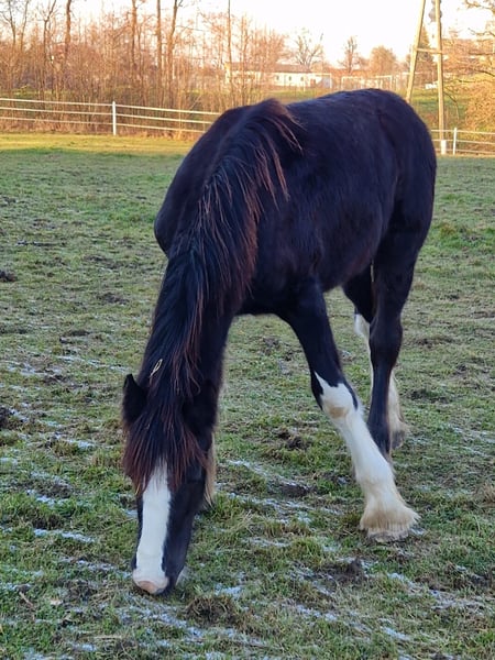 Grazie per l'interesse nel nostro stallone Shire Horse, Fraggle. Shire Horse Fraggle è nato nell'estate del 2024 ed è un bellissimo giovane. Mantiene il colore scuro. La mamma Grace ha un'altezza di 1,85 m, mentre il papà Duke raggiunge i 1,94 m. Pertanto, è probabile che anche Fraggle diventi un rappresentante di taglia maggiore della sua razza. Sfortunatamente, si è sviluppato un gonfiore nelle articolazioni della caviglia di Fraggle, il che ha confermato il sospetto di un chip. Attualmente, Fraggle è privo di zoppia e non ha alcun problema. Dopo aver consultato i nostri veterinari, è stato deciso di non procedere con un intervento chirurgico al momento. Tuttavia, Fraggle è ora offerto a un prezzo inferiore al suo valore a causa di questa situazione - in ogni caso, preferiamo il posto al prezzo. Fraggle proviene dal nostro allevamento e quindi è sotto la nostra cura fin dal primo momento. Fraggle colpisce in particolare per il suo aspetto adorabile. Inizialmente è scettico nei confronti delle nuove persone. Una volta che ha guadagnato fiducia, però, ama le coccole e le sessioni di pulizia. È addestrato a indossare il capestro e conosce tutte le "attività standard" di un puledro (pulizia, cura degli zoccoli, ecc.). Attualmente non è molto entusiasta della cura degli zoccoli, il che dipende un po' dal suo umore del giorno. Abbiamo già completato i primi "viaggi in trailer" con lui, facendogli conoscere senza stress il "mostro trasportatore" come una scatola di cibo mobile. Fraggle è cresciuto insieme ai suoi simili in un branco misto nelle nostre ampie aree di pascolo, il che riteniamo sia particolarmente importante per la salute e l'equilibrio dei nostri cavalli. Attualmente, Fraggle vive con i suoi compagni di gioco in un allevamento di puledri in un sistema di stalla aperta/box con accesso libero. Ci auguriamo per lui una nuova casa con molta compagnia di cavalli. Fraggle è attualmente piuttosto sottomesso e molto facile da gestire con altri cavalli, indipendentemente dall'età dell'altro. Naturalmente, è microchippato, vaccinato e sverminato regolarmente. Chi cerca un bellissimo giovane Shire Horse da accompagnare affettuosamente come partner, può contattarci volentieri. I nostri animali vengono ceduti solo a mani esperte e a una casa adeguata all'età, quindi ci teniamo a prendere il tempo necessario per i potenziali acquirenti. È anche importante per noi che il cavallo partecipi alla decisione - perché anche per i nostri animali deve esserci una buona chimica. Fraggle vive vicino a Bad Füssing - saremo lieti di fornire l'indirizzo esatto al momento della prenotazione. Ulteriori impressioni sui nostri cavalli possono essere trovate anche sul nostro canale WhatsApp. Se interessati, saremo felici di inviare il link. Oltre a Fraggle, offriamo anche altri cavalli in vendita, non esitate a contattarci per ulteriori informazioni. In ogni caso, preferiamo il posto al prezzo. Saremmo quindi molto felici di ricevere una breve descrizione della nuova casa. Non vediamo l'ora di ricevere il vostro messaggio.