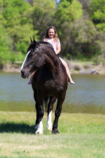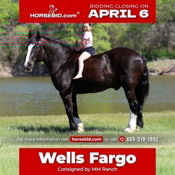 🌟𝑨𝒑𝒓𝒊𝒍 𝐀𝐋𝐋 𝐒𝐓𝐀𝐑 𝐋𝐈𝐍𝐄𝐔𝐏🌟 Happening now thru MONDAY | APRIL 6th - Available EXCLUSIVELY on HorseBid's website! For more details and to register visit: www.Horsebid.com CONSIGNOR CONTACT: MM Ranch 469-318-1902 LOCATION: Forney, TX BREED: Shire Crossbred REGISTERED: No COLOR: Black HEIGHT: 16.2 AGE: 16 GENDER: Gelding This is one is a good one. ☝️ Meet Wells Fargo. A shire crossbred. Yes he is a half shire. He is an unbelievable cool horse. Absolutely as gentle and sweet as a puppy. And so much fun to ride. Wells Fargo is a 16.2 hands tall stunning black gelding. This is one cool crossbred horse. He is so sweet and loves attention. He will walk right up to you in the pasture and he wants you to catch him. He loves going on adventures. Truly loves being around people. Seriously you cannot walk out to the pasture without him being in your pocket and wanting to follow you everywhere you go. Wells Fargo came off a big ranch in Montana. Where he was being used like a ranch horse. They used him like as if he was a small quarter horse. He doesn’t know he is big. Really he is a perfect size for a crossbred. He is big but not too big. They treated him just like all the other horses. They did all the chores on him. From pulling a hay wagon to put out hay. (Both single and double). To riding out on the ranch to check cattle. To packing supplies up into the mountains. Even has been roped off of. He is what I would call a seasoned trail horse that has extensive seen lots of country. Been in the steepest parts of the mountains. He can handle any terrain. Can also handle being in town around cars, big trucks, trains, bikes, etc.. Loves to cross water (so he can play in it). Has had a gun shoot off of him and around him. Used durning hunting season as well to pack out deer and elk. He is been there done that type. Has had lots of mileage put on him. For a big horse he has the smooth trot and lope. And super easy to get into a lope. You don’t have to kick hard. Just give him a smooch. Has a lot of handle. Neck reins. Backs. Side passes. Really broke and soft in the bridle. Responsive to all cues. Whether on his back or on the ground. You don’t have to pull hard. He is very soft both in his mouth and to side cues. We just ride him with simple short shank snaffle. He is also aware and cautious with his surroundings. Our little sweet 12 lb puppy is always running around his feet and also the kids. He makes sure to not step on them. I would say Wells Fargo is suitable for any age or riding experience. He is safe. Absolutely no bad habits or quirks about him. I think he would make an excellent mount police horse. He has so much experience and patience that would make him perfect for those situations. Nothings scares him. Not all at spooky or over reactive. He is experienced around being in town around traffic and all the excitement. Wells Fargo doesn’t require anything special. We use our standard size saddle, girts, and a quarter horses headstall and bit. We didn’t have to get anything extra or special for him. He is an easy keeper. He is sound in every way. Absolutely healthy. Nothing wrong with him. We did have a pre evaluation done on him by our vet. (Will include in the pics). Horses like Wells Fargo are few and far between. Your neighbors won’t have one like him. You will stand out riding him. He is absolutely beautiful. Call us if you would like anymore info about him. We would be happy to help you arrange shipping on him anywhere.