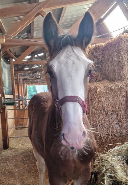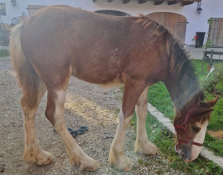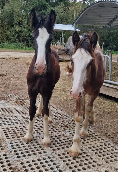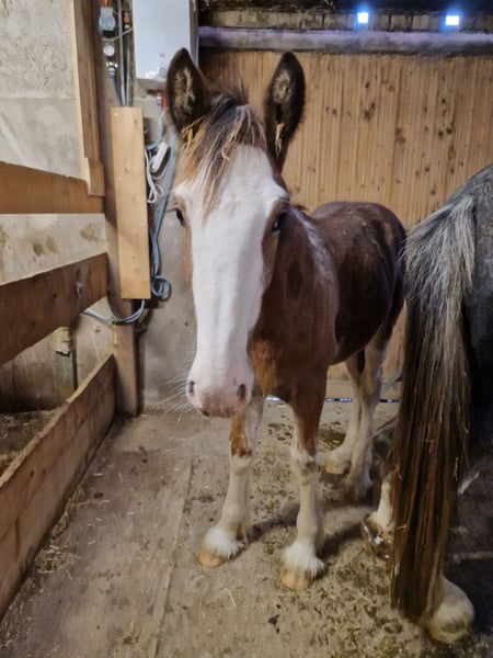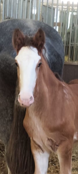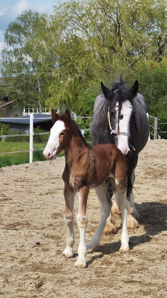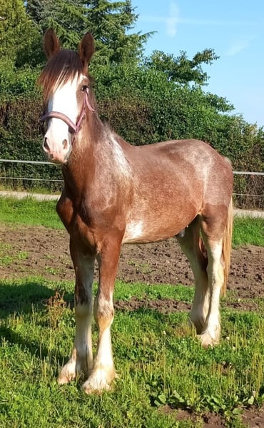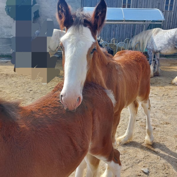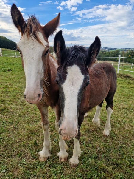 Thank you for your interest in our Shire Horse gelding Hidalgo. Hidalgo was born in May 2023 and is a real "cuddlebug". Since both parents are characterized by a good-natured and relaxed character, he also promises to become a dear and uncomplicated representative of his breed - in special color. Hidalgo is already proving to be uncomplicated and gentle. Both parents are available to meet. Both the 1.94 meter tall dad Duke and mom Olivia (height approx. 1.80 meters) are in our possession. Hidalgo grew up in a mixed herd with lots of playmates and currently lives with other Shires of different ages in an open stable. In the evenings, they go out together in the large group to the extensive pastures. So far, he has been friendly and uncomplicated towards all other horses. He is extremely people-oriented and sweet to handle and particularly enjoys extended petting and attention. Hidalgo is well-behaved at the farrier and vet, is easy to lead, hitch up and groom and has already mastered his first trailer rides flawlessly. He is familiar with tractors, dogs and all sorts of other small and large animals from his daily life on the farm. Of course, Hidalgo is fully vaccinated and receives all the necessary vaccinations and worming treatments to ensure that he continues to grow into a healthy and lively Shire Horse. If you are looking for a Shire Horse with a gentle and people-oriented character, which he wants to accompany lovingly to his life as a partner at his side, please contact us. Our animals are only placed in the best hands and in a home appropriate to their age, so it is important to us to take enough time for interested parties. It is also very important to us that the horse has a say in the decision, because the chemistry has to be right for our animals too. We are happy to arrange a "Shire Horse Day" at our farm to get to know Hidalgo so that we can get to know each other in peace and without stress. Hidalgo lives near Bad Füssing. Accommodation is available within walking distance of our farm. If you are interested, we also offer accompanied rides on our gentle giants in beautiful natural surroundings. We also have a good network of transportation companies. If transport needs to be organized, we are happy to help with reliable and trustworthy contacts. We look forward to hearing from you for Hidalgo.
