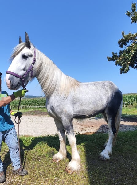✨ Shire Horse WALLACH – imposant, frech und charakterstark ✨ Zum Verkauf steht ein beeindruckender Shire Horse Wallach geboren im Jahr 2022. Dieser prachtvolle Schimmel besticht durch seine elegante Erscheinung und tollen Gangarten. Er weiß ich in Szene zu setzen. Zur Zeit hat er ein Stockmaß von 1,80m. Er ist echter Hingucker, der durch seine Ausstrahlung und sein keckes Wesen begeistert. Im täglichen Umgang zeigt er sich etwas vorlaut und ist derzeit voll in der Pubertät. Seit kurzem ist er Wallach. (War Klopphengst) Er eignet sich ideal für erfahrene Pferdemenschen, die Freude daran haben, ihn weiter auszubilden und zu fördern. Und mit seinem außergewöhnlichen Gängen wird er bestimmt mal ein tolles Reitpferde. Bitte zu bedenken dass Shire Horse spät Entwickler sind und nicht vor 5 Jahren begonnen werden sollen mit dem Beritt