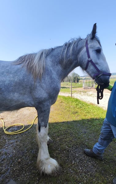 ✨ Étalon de Shire – impressionnant, amical et doté d’un caractère fort ✨ Nous proposons à la vente un magnifique étalon de Shire, né en 2022. Ce splendide gris perle se distingue par sa taille impressionnante de 1,80 m, son allure élégante et son tempérament calme et équilibré. Il séduit par son caractère doux et sa volonté d'apprendre – un véritable eye-catcher, qui impressionne par son charisme et sa nature amicale. Au quotidien, il se montre attentif, proche de l’humain et facile à vivre. L’étalon est en bonne santé, régulièrement vacciné et vermifugé. Il convient parfaitement à des cavaliers expérimentés, qui prennent plaisir à continuer son dressage et à favoriser son développement. Étant un étalon non castré, la opération de castration coûtera environ 2 000 €, ce qui explique son prix nettement inférieur à sa valeur initiale – au lieu de 8 500 €, il est proposé à 4 900 €. Cette réduction de prix vise à assurer qu’il trouve des mains responsables, où il pourra continuer à évoluer et à recevoir les soins appropriés. Avec son allure impressionnante, son tempérament calme et ses solides bases, c’est un cheval idéal pour ceux qui recherchent quelque chose d’exceptionnel – un Shire Horse avec du cœur, de la force et beaucoup de potentiel.