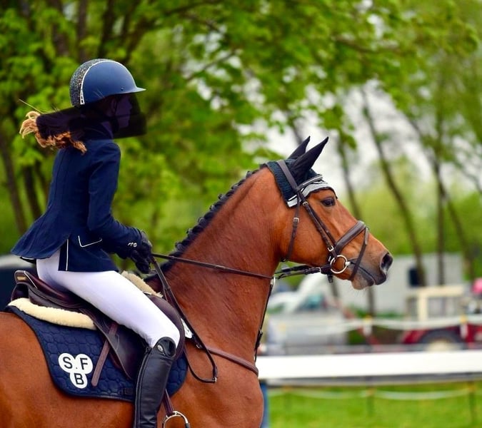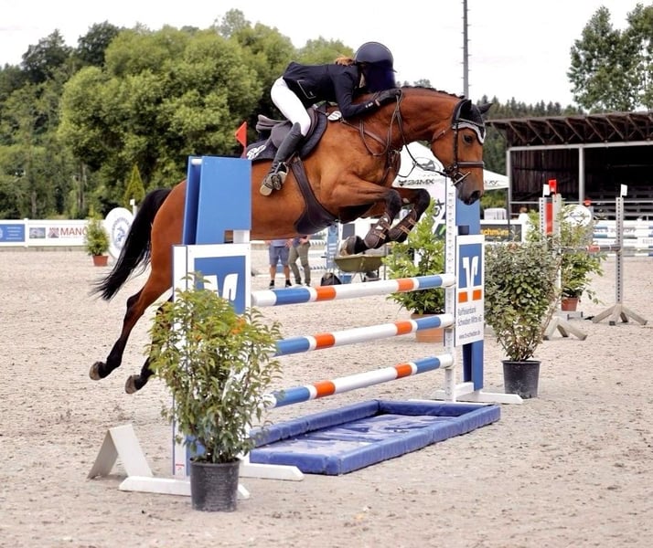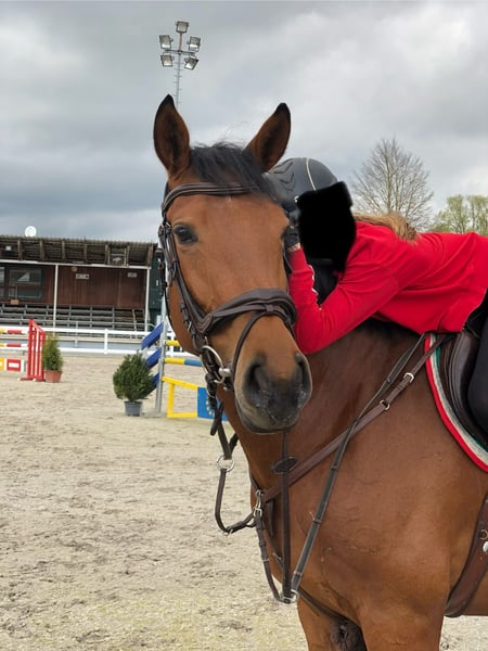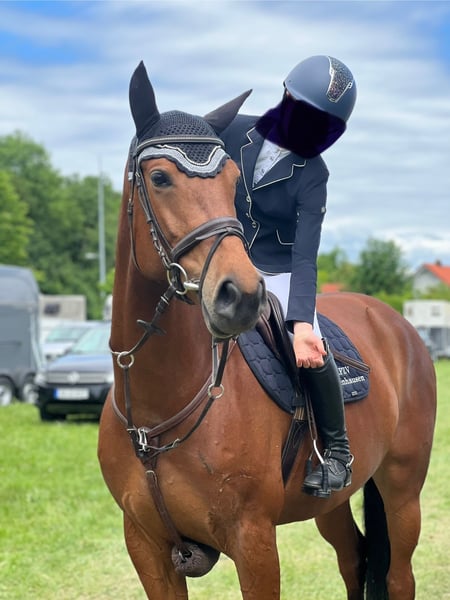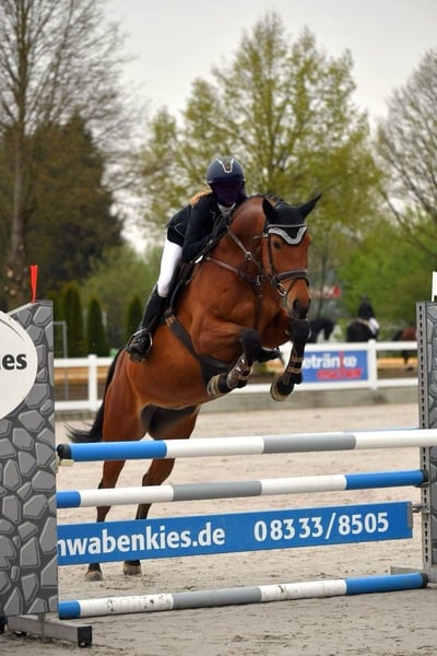 Wir kauften Mathilda als Springpferd für meine damals 15jährige Tochter. Bis A** Springen ist sie eine sichere Bank, hat hier ganz selten Fehler und war dementsprechend viel platziert (51 Platzierungen, davon 12 Siege). In L war sie ebenfalls schon platziert, aber nicht so konstant. In 2024 holten die beiden den 3. Platz bei der schwäbischen Meisterschaft U18. Bisher war der Turniersport für uns zweitrangig (aufgrund Schule), meine Tochter ist deshalb nur ab und zu bei Turnieren gestartet. Das soll sich nun ändern. Für den ganz großen Springsport ist Mathilda aber leider nicht vermögend genug. Sie will grundsätzlich keine Stangen werfen und deshalb bringt eine Überforderung nur Unruhe in die sonst routinierten Abläufe. Auch wenn es uns sehr schwerfällt, müssen wir aus sportlicher Sicht an diesem Punkt den nächsten Schritt gehen und für Mathilda einen Sportpartner suchen, der zu ihr passt und der ihre Qualitäten zu schätzen weiß. In der Dressur wurde sie bisher nicht gefördert, bringt aber definitiv Potential mit, das man nutzen sollte. Vergangenes Jahr startete sie wegen einer Kreismeisterschaft bei einer A Dressur und es gab viel Lob. Laut Protokoll halten die Richter sie für ein „veranlagtes Pferd“. Daraufhin gab es einen weiteren Versuch bei einem Dressurturnier, bei dem sie dann gleich platziert war. Da wir in einem absolut springorientierten Stall stehen, war dies aber nur ein kleiner „Ausflug“ in den Dressursport. Mit einem entsprechenden Trainer ist hier sicher noch einiges möglich, zumal sie sich in der täglichen Arbeit sehr zufrieden und leistungsbereit zeigt. Die Kombination aus Dressur- und Springsport – definitiv bis A-Niveau und vielleicht sogar bis L – in Verbindung mit ihrem absolut unkomplizierten Wesen im Umgang macht Mathilda zu einem tollen Partner für eine/n motiviertere/n Reiter/in als Lehrmeisterin! Ich selbst habe erst vor ca. 6 Jahren das Reiten angefangen und reite max. 1x pro Woche und mir hat Mathilda sooo viel beigebracht. Sie reagiert fein auf eine korrekte Hilfengebung und belohnt ein gutes Training mit Losgelassenheit und Anlehnung und dem guten Gefühl, dass Pferd und Reiter eine Einheit sein können. Außerdem ist sie in jeder Gangart mega "bequem" zu sitzen. Für absolute Anfänger ist sie vielleicht nicht geeignet, da sie wie gesagt auf richtige Hilfengebung reagiert. Charakter: TOP!!! Mathilda ist menschenbezogen, anständig, absolut nicht schreckhaft, sehr umgänglich mit anderen Pferden, unkompliziert beim Verladen und allgemein auf Turnieren, hat vor fast nichts Angst und freut sich immer über Streicheleinheiten. Jedes kleine Kind kann sie allein von der Koppel holen, führen, putzen usw. Auf einem Turnier hat man keinerlei Stress mit ihr und kann sich auf andere Dinge konzentrieren. Sie geht mit verschiedenen anderen Pferden auf die Koppel und es gab noch nie Probleme. Auch im Gelände kann man viel Spaß mit ihr haben – egal ob alleine oder in der Gruppe. Gesundheit: AKU vorhanden aus 2022; Keine Krankheiten oder Vorschäden; regelmäßig geimpft; gute und robuste Konstitution Bei ehrlichem Interesse ist selbstverständlich Probereiten möglich. Da wir schlechte Erfahrungen gemacht haben, findet ein erstes Probereiten auf jeden Fall in Anwesenheit eines Reitlehrers statt. Hierfür fallen Kosten in Höhe von 30 € an, die im Falle eines Kaufs natürlich verrechnet werden. Terminvereinbarungen sind unter folgender Nummer möglich: 0171 8316608