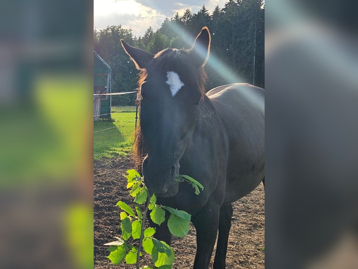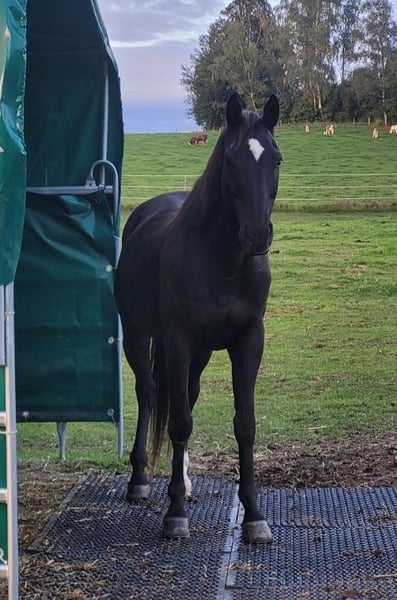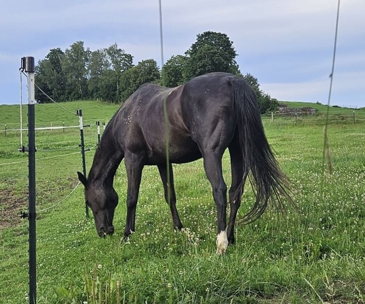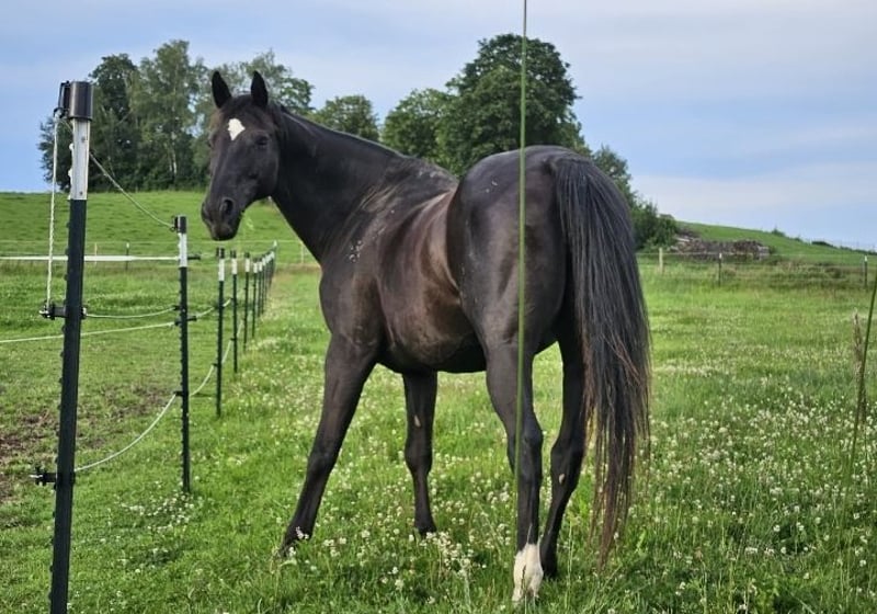 Mein Pferd Romeo sucht ein liebevolles Zuhause. Wunderschöner Farbwechsler Wallach zwischen dunkelbraun und schwarz, ein Slowakisches Warmblut, 13 Jahre alt mit 157 cm Stockmaß. Er ist freundlich und eingeritten, benötigt aber einen erfahrenen Reiter der ihm Sicherheit gibt, weil er schreckhaft auf unerwartetes reagiert. Er mag es aber auch, wenn man nur mit ihm spazieren geht. Romeo läuft barhuf und hat keine bekannten gesundheitlichen Einschränkungen. Er ist brav beim Hufschmied und wird im 10 Wochen Rhythmus ausgeschnitten. Bis 2023 wurde er kalt Beschlagen, danach nicht mehr, weil der Hauptaufenthalt auf der Weide ist, er läuft aber auch auf der Straße oder Feldweg ohne Probleme. Beim Putzen und Satteln bleibt er geduldig stehen. Er wird regelmäßig entwurmt. Er ist seit Mitte 2022 mit Jamie bei uns Zuhause im Offenstall mit dauerhaften Auslauf auf 400 bis 4000m², je nach Wetterbedingungen. Bei uns hatte er auch Kontakt mit einigen Hunden, Katzen, Hühnern und Kühen (letztere auf dem Nachbargrundstück).