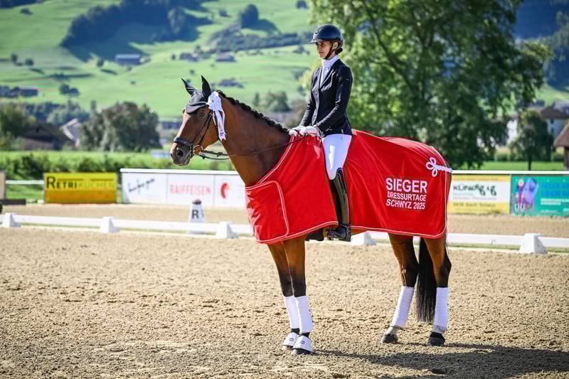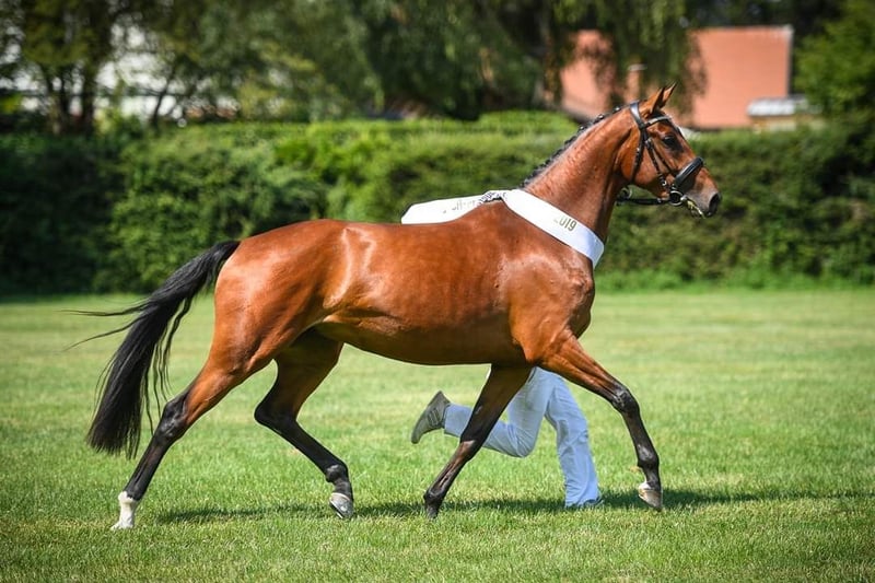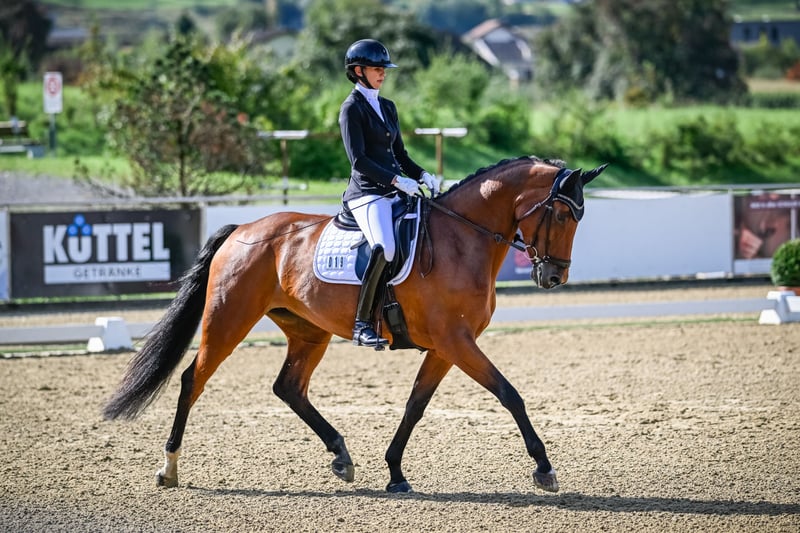 Jolie et très intelligente jument, qui souhaite toujours bien faire tout en étant capable de pardonner ses erreurs. Une offre très intéressante pour le dressage avec option de reproduction. Cette année, la jument a remporté la classe L et a été placée à chaque concours cette saison. Elle possède un bon tempérament avec un léger impulsion en avant, sans comportements indésirables tels que partir au galop, faire des éboulis ou des bocks. Elle serait donc également la partenaire idéale pour les cavaliers juniors, d’autant plus qu’elle pardonne les erreurs du cavalier. Elle maîtrise toutes les figures requises en M, ce qui lui permettrait de débuter également en classe M l’année prochaine. À l’âge de 3 ans, cette jument a été Miss Suisse, ce qui témoigne de sa lignée de haute qualité. Elle est également une reproductrice primée. Elle a déjà un fils par Casino Berlin, qui a lui aussi 3 ans et a déjà convaincu lors du test de performance.